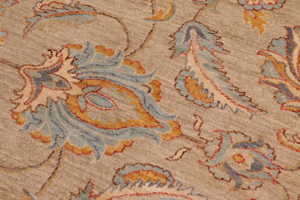 Enhance the ambiance of your home with this magnificent Persian-influenced Turkish hand-knotted rug made by skilled artisans capable of creating the most exceptional vegetable dyes and hand-spun wool. This exquisite handmade rug is a one-of-a-kind Peshawar Kafkaz, otherwise identified as Chobi, Chobi Peshawar, Oushak, or Ziegler rug. These handmade rugs are crafted in Pakistan utilizing superior-quality wool imported from Australia, New Zealand, and Korea in two types of weaves: the Persian weave and the Mori weave. This rug is meticulously crafted by hand using the finest natural vegetable dyes extracted from local plants. The artisans use a blend of hand-spun local and fine merino wool, resulting in a rug with a compelling texture, higher lanolin content, and longer staple. The artisans occasionally incorporate natural or artificial silk into the pile to enhance specific motifs. The finished product is an awe-inspiring execution of flawless design and an understated palette that exudes elegance. Contemporary Peshawar rugs draw inspiration from antique Persian designs and feature modern design motifs with vibrant color tones. Hand-knotted with all-natural dyes, resulting in a unique abrash effect and subtle color variations in the pile. Peshawar rugs are known for their stunning and vibrant colors, achieved through a process inspired by antique methods. The rug's pile is meticulously trimmed to a moderate thickness and then stone-washed and sun-dried, resulting in a natural sheen and pleasing color tones. Transform the ambiance of your room into a luxurious haven with this gorgeous rug featuring a beautiful color palette. This stunning rug features an intricate oriental design that showcases royalty and seamlessly complements any decor. Its hand-knotted construction and natural fibers provide a soft and comfortable feel underfoot, making it the perfect addition to any room.