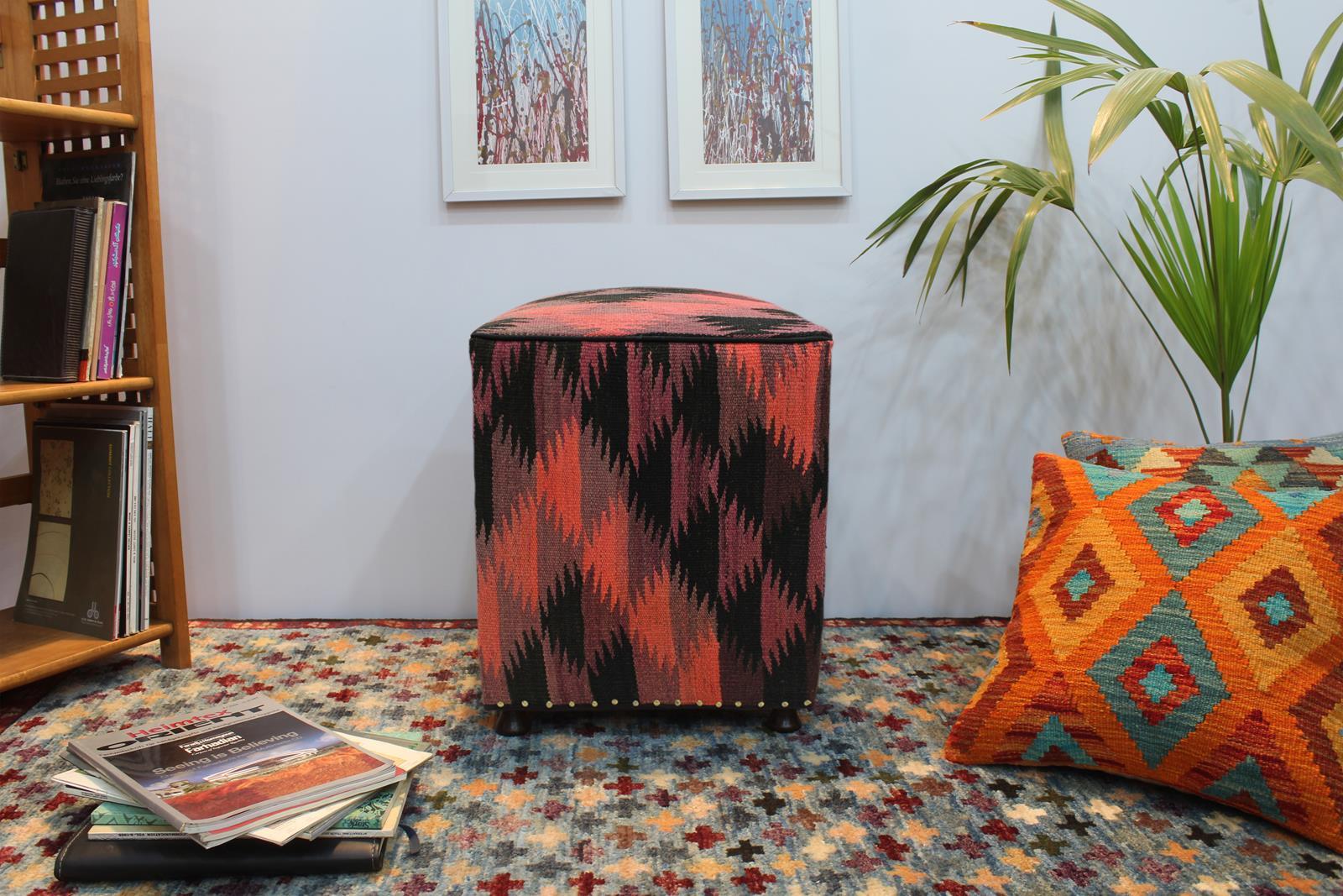 Chic handmade ottoman crafted using wood and upholstered using hand-woven kilim wool rug is a multi-purpose fashion pouf which will add dimension, color and style to your decor. Inspired by geometric motifs in any array of effervescent color pallet grounds any space with elegance and sophistication.