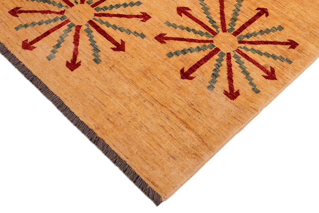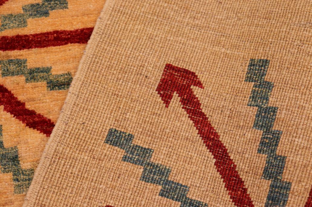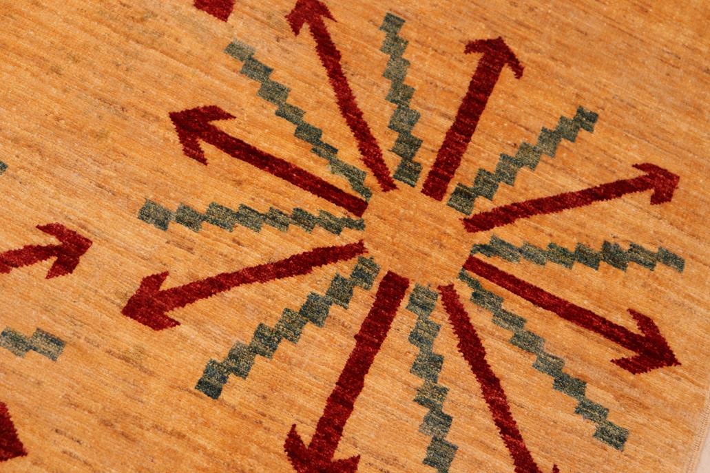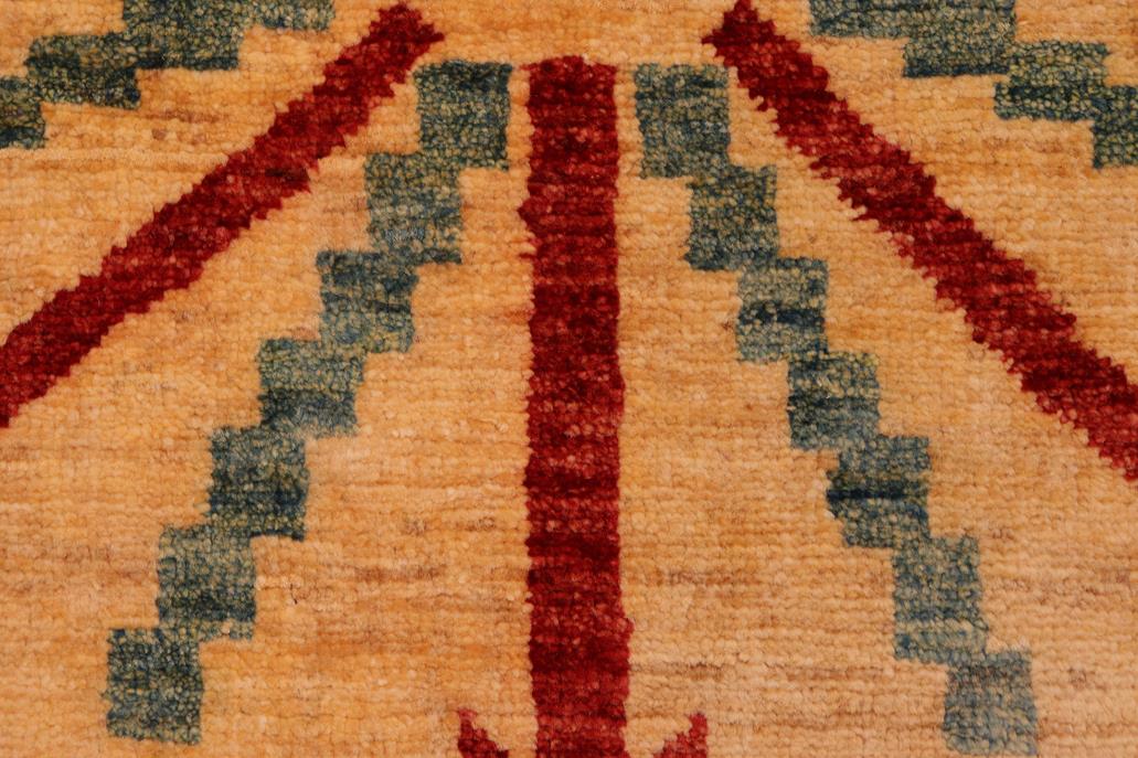 Enhance the ambiance of your home with this magnificent Persian-influenced Turkish hand-knotted rug made by skilled artisans capable of creating the most exceptional vegetable dyes and hand-spun wool. This exquisite handmade rug is a one-of-a-kind Peshawar Kafkaz, otherwise identified as Chobi, Chobi Peshawar, Oushak, or Ziegler rug. These handmade rugs are crafted in Pakistan utilizing superior-quality wool imported from Australia, New Zealand, and Korea in two types of weaves: the Persian weave and the Mori weave. This rug is meticulously crafted by hand using the finest natural vegetable dyes extracted from local plants. The artisans use a blend of hand-spun local and fine merino wool, resulting in a rug with a compelling texture, higher lanolin content, and longer staple. The artisans occasionally incorporate natural or artificial silk into the pile to enhance specific motifs. The finished product is an awe-inspiring execution of flawless design and an understated palette that exudes elegance. Contemporary Peshawar rugs draw inspiration from antique Persian designs and feature modern design motifs with vibrant color tones. Hand-knotted with all-natural dyes, resulting in a unique abrash effect and subtle color variations in the pile. Peshawar rugs are known for their stunning and vibrant colors, achieved through a process inspired by antique methods. The rug's pile is meticulously trimmed to a moderate thickness and then stone-washed and sun-dried, resulting in a natural sheen and pleasing color tones. Transform the ambiance of your room into a luxurious haven with this gorgeous rug featuring a beautiful color palette. This stunning rug features an intricate oriental design that showcases royalty and seamlessly complements any decor. Its hand-knotted construction and natural fibers provide a soft and comfortable feel underfoot, making it the perfect addition to any room.