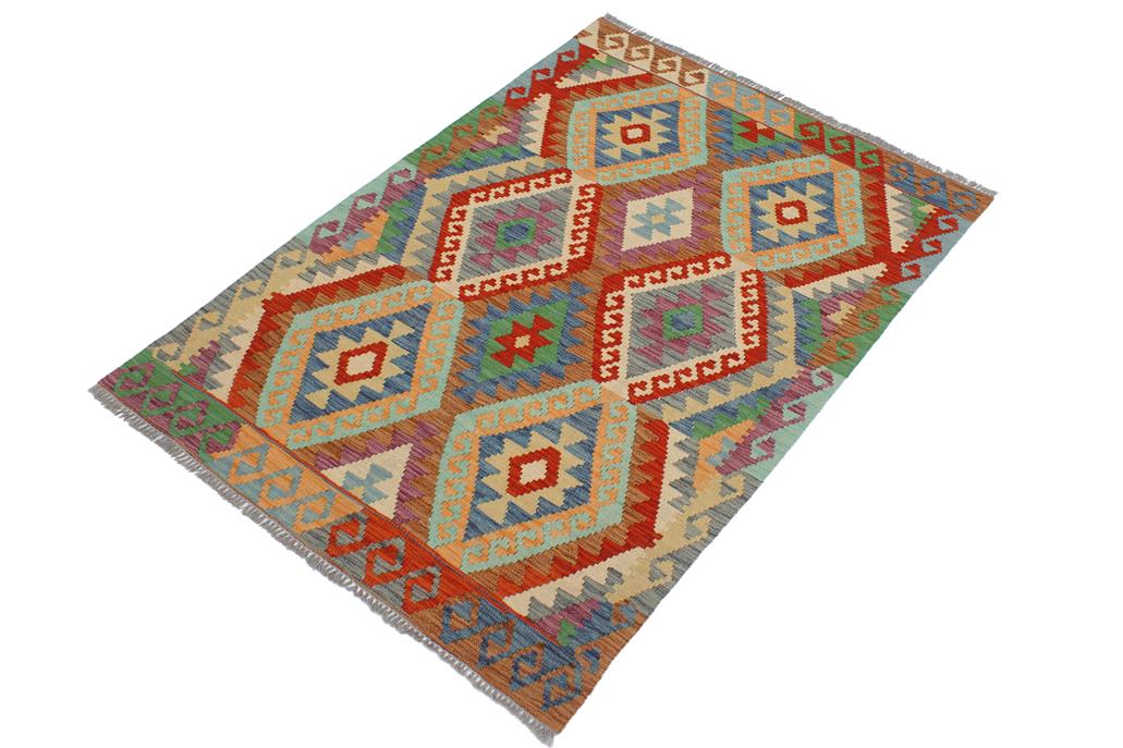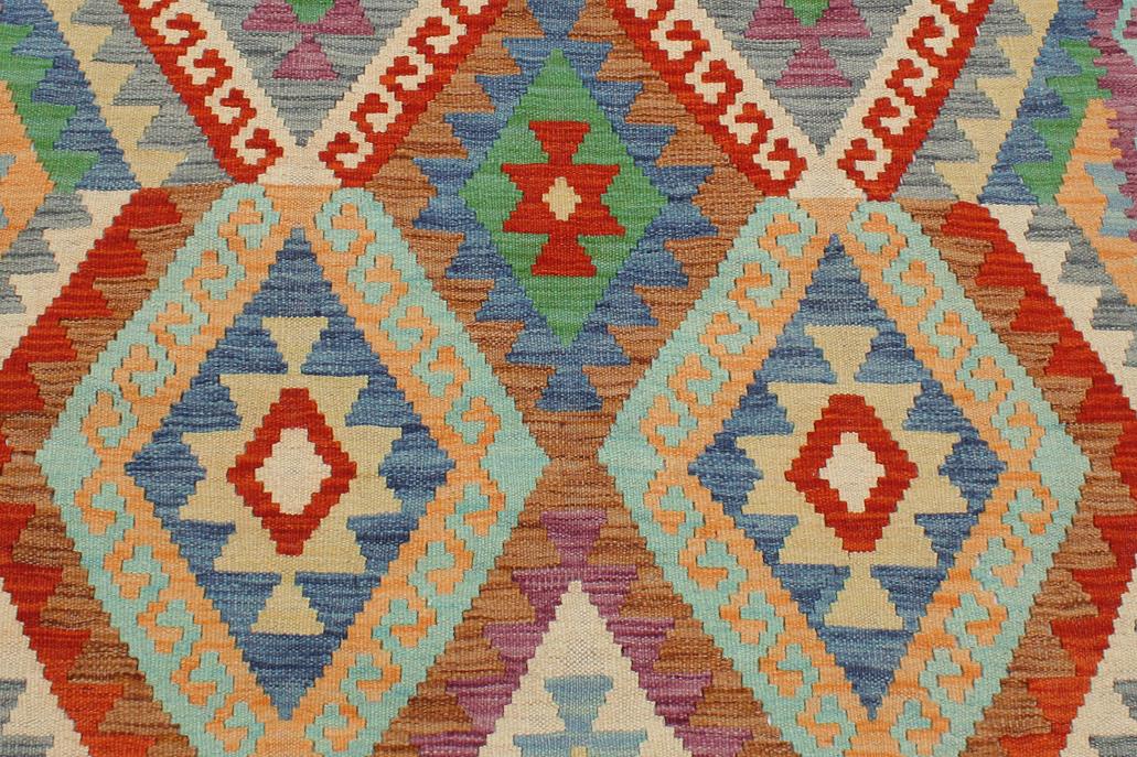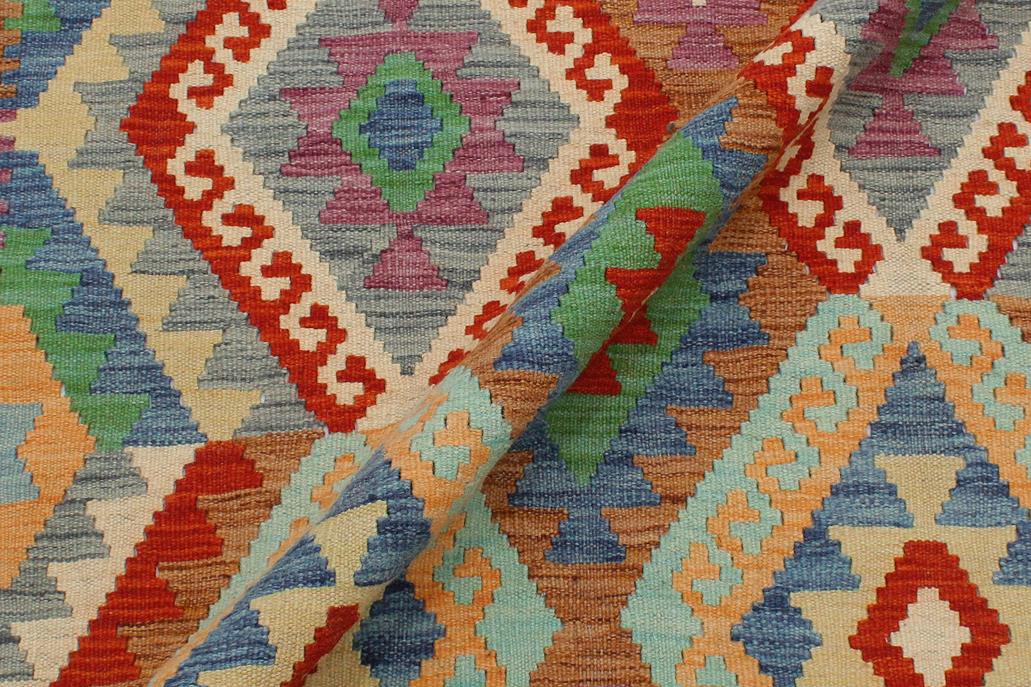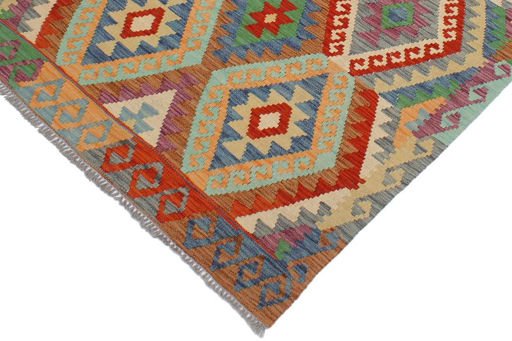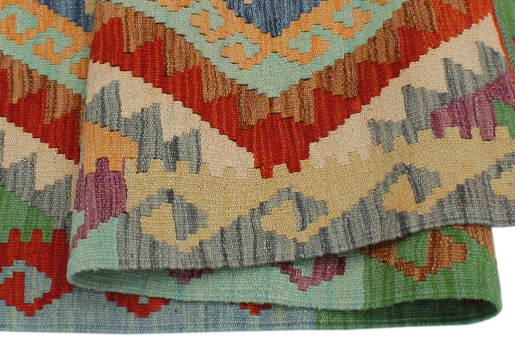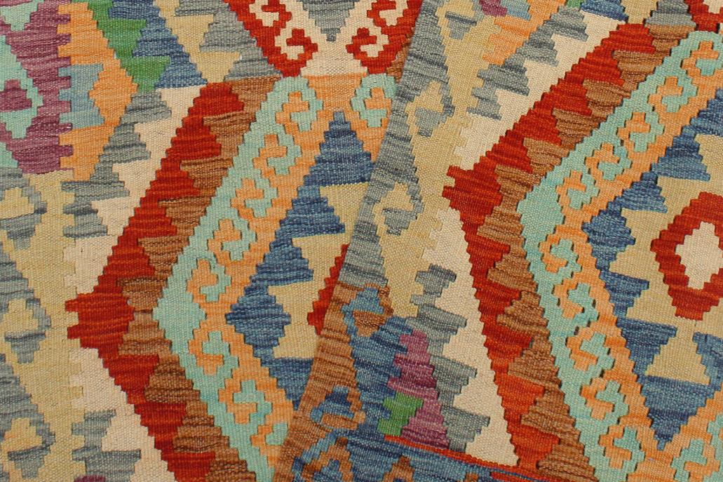 Elevate the elegance of your home with this stunning hand-woven tribal Kilim wool rug. Meticulously crafted on a loom by the Nomad Turkman people using hand-spun wool and 100% natural vegetable dyes, these rugs are recognized for their repetitive geometric patterns, incorporating naturalistic floral and traditional designs. The contemporary fashion palette results in bold, sharp patterns that are incredibly versatile, as the pattern is the same on both sides. These reversible rugs feature a lighter shade on one side and brighter colors on the other, providing versatility according to preference. These unique rugs are made by knotting short strands of different colors onto the warps and securing them by tightly pressing the wefts. The designs are created by interweaving the various colored wefts and warps. Kilims are known for their exceptional durability and versatility, making them truly unique rugs.