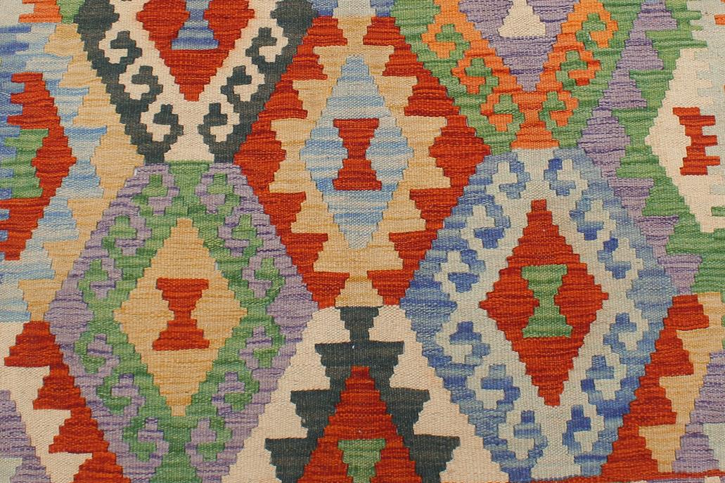 Elevate the elegance of your home with this stunning hand-woven tribal Kilim wool rug. Meticulously crafted on a loom by the Nomad Turkman people using hand-spun wool and 100% natural vegetable dyes, these rugs are recognized for their repetitive geometric patterns, incorporating naturalistic floral and traditional designs. The contemporary fashion palette results in bold, sharp patterns that are incredibly versatile, as the pattern is the same on both sides. These reversible rugs feature a lighter shade on one side and brighter colors on the other, providing versatility according to preference. These unique rugs are made by knotting short strands of different colors onto the warps and securing them by tightly pressing the wefts. The designs are created by interweaving the various colored wefts and warps. Kilims are known for their exceptional durability and versatility, making them truly unique rugs.