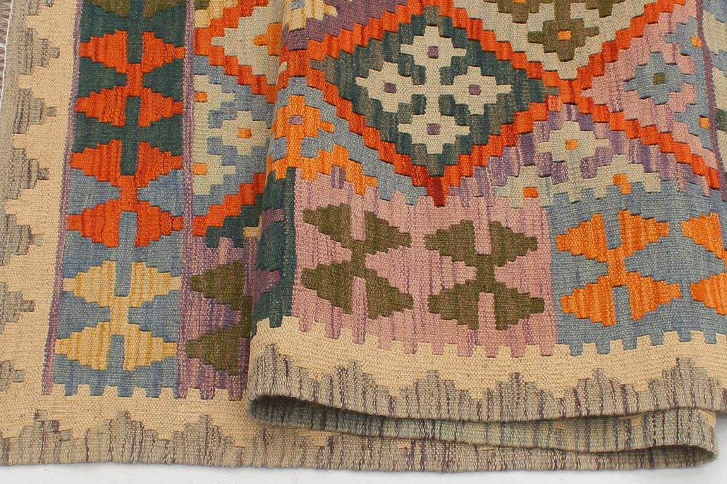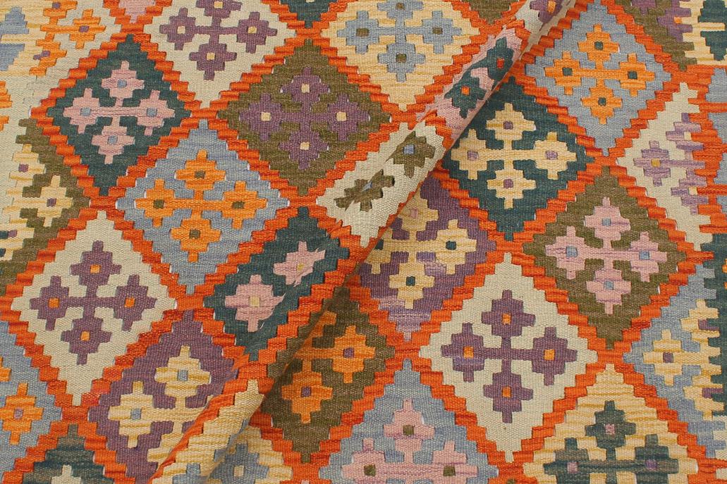 Elevate the elegance of your home with this stunning hand-woven tribal Kilim wool rug. Meticulously crafted on a loom by the Nomad Turkman people using hand-spun wool and 100% natural vegetable dyes, these rugs are recognized for their repetitive geometric patterns, incorporating naturalistic floral and traditional designs. The contemporary fashion palette results in bold, sharp patterns that are incredibly versatile, as the pattern is the same on both sides. These reversible rugs feature a lighter shade on one side and brighter colors on the other, providing versatility according to preference. These unique rugs are made by knotting short strands of different colors onto the warps and securing them by tightly pressing the wefts. The designs are created by interweaving the various colored wefts and warps. Kilims are known for their exceptional durability and versatility, making them truly unique rugs.