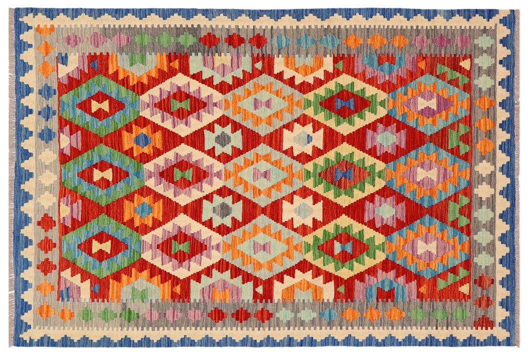 Elevate the elegance of your home with this stunning hand-woven tribal Kilim wool rug. Meticulously crafted on a loom by the Nomad Turkman people using hand-spun wool and 100% natural vegetable dyes, these rugs are recognized for their repetitive geometric patterns, incorporating naturalistic floral and traditional designs. The contemporary fashion palette results in bold, sharp patterns that are incredibly versatile, as the pattern is the same on both sides. These reversible rugs feature a lighter shade on one side and brighter colors on the other, providing versatility according to preference. These unique rugs are made by knotting short strands of different colors onto the warps and securing them by tightly pressing the wefts. The designs are created by interweaving the various colored wefts and warps. Kilims are known for their exceptional durability and versatility, making them truly unique rugs.
