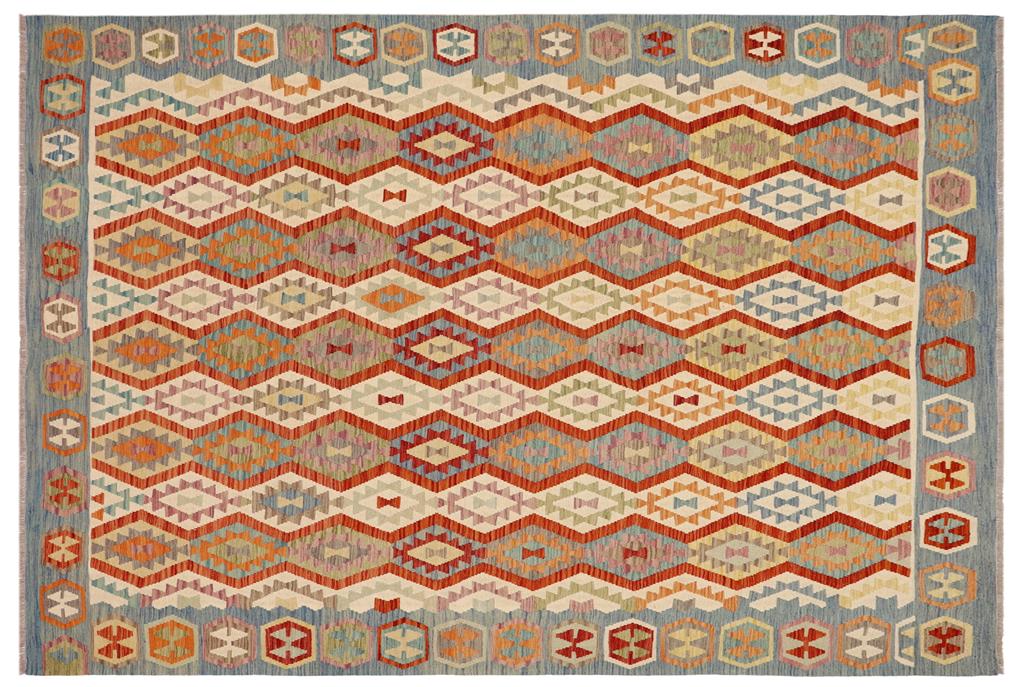 Elevate the elegance of your home with this stunning hand-woven tribal Kilim wool rug. Meticulously crafted on a loom by the Nomad Turkman people using hand-spun wool and 100% natural vegetable dyes, these rugs are recognized for their repetitive geometric patterns, incorporating naturalistic floral and traditional designs. The contemporary fashion palette results in bold, sharp patterns that are incredibly versatile, as the pattern is the same on both sides. These reversible rugs feature a lighter shade on one side and brighter colors on the other, providing versatility according to preference. These unique rugs are made by knotting short strands of different colors onto the warps and securing them by tightly pressing the wefts. The designs are created by interweaving the various colored wefts and warps. Kilims are known for their exceptional durability and versatility, making them truly unique rugs.