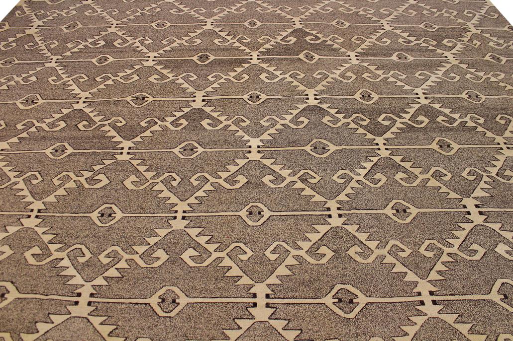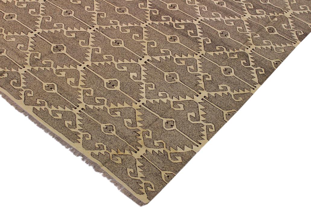 Elevate the elegance of your home with this stunning hand-woven tribal Kilim wool rug. Meticulously crafted on a loom by the Nomad Turkman people using hand-spun wool and 100% natural vegetable dyes, these rugs are recognized for their repetitive geometric patterns, incorporating naturalistic floral and traditional designs. The contemporary fashion palette results in bold, sharp patterns that are incredibly versatile, as the pattern is the same on both sides. These reversible rugs feature a lighter shade on one side and brighter colors on the other, providing versatility according to preference. These unique rugs are made by knotting short strands of different colors onto the warps and securing them by tightly pressing the wefts. The designs are created by interweaving the various colored wefts and warps. Kilims are known for their exceptional durability and versatility, making them truly unique rugs.