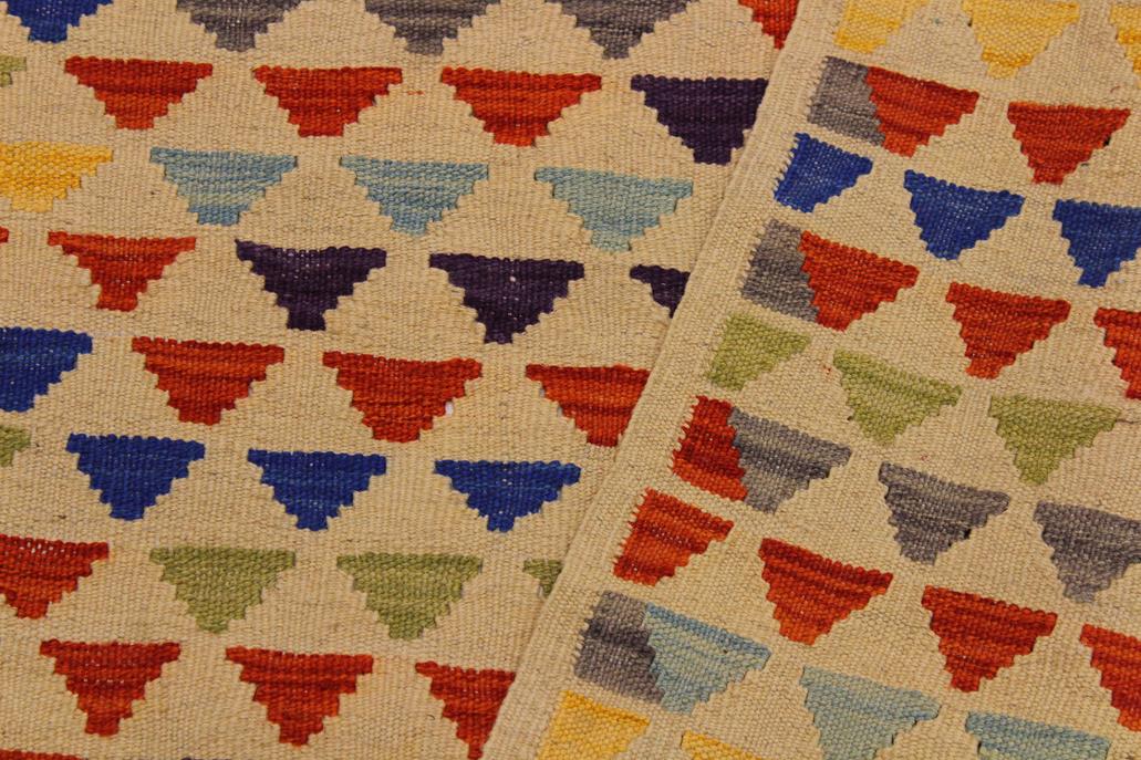 Elevate the elegance of your home with this stunning hand-woven tribal Kilim wool rug. Meticulously crafted on a loom by the Nomad Turkman people using hand-spun wool and 100% natural vegetable dyes, these rugs are recognized for their repetitive geometric patterns, incorporating naturalistic floral and traditional designs. The contemporary fashion palette results in bold, sharp patterns that are incredibly versatile, as the pattern is the same on both sides. These reversible rugs feature a lighter shade on one side and brighter colors on the other, providing versatility according to preference. These unique rugs are made by knotting short strands of different colors onto the warps and securing them by tightly pressing the wefts. The designs are created by interweaving the various colored wefts and warps. Kilims are known for their exceptional durability and versatility, making them truly unique rugs.