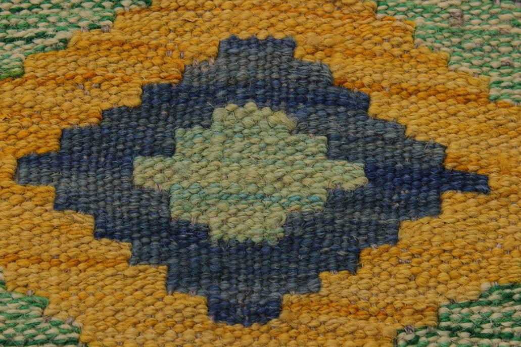 Elevate the elegance of your home with this stunning hand-woven tribal Kilim wool rug. Meticulously crafted on a loom by the Nomad Turkman people using hand-spun wool and 100% natural vegetable dyes, these rugs are recognized for their repetitive geometric patterns, incorporating naturalistic floral and traditional designs. The contemporary fashion palette results in bold, sharp patterns that are incredibly versatile, as the pattern is the same on both sides. These reversible rugs feature a lighter shade on one side and brighter colors on the other, providing versatility according to preference. These unique rugs are made by knotting short strands of different colors onto the warps and securing them by tightly pressing the wefts. The designs are created by interweaving the various colored wefts and warps. Kilims are known for their exceptional durability and versatility, making them truly unique rugs.