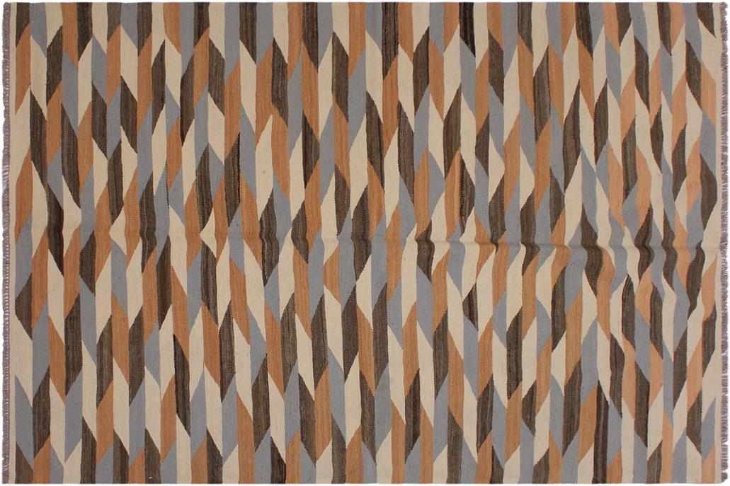 Elevate the elegance of your home with this stunning hand-woven tribal Kilim wool rug. Meticulously crafted on a loom by the Nomad Turkman people using hand-spun wool and 100% natural vegetable dyes, these rugs are recognized for their repetitive geometric patterns, incorporating naturalistic floral and traditional designs. The contemporary fashion palette results in bold, sharp patterns that are incredibly versatile, as the pattern is the same on both sides. These reversible rugs feature a lighter shade on one side and brighter colors on the other, providing versatility according to preference. These unique rugs are made by knotting short strands of different colors onto the warps and securing them by tightly pressing the wefts. The designs are created by interweaving the various colored wefts and warps. Kilims are known for their exceptional durability and versatility, making them truly unique rugs.
