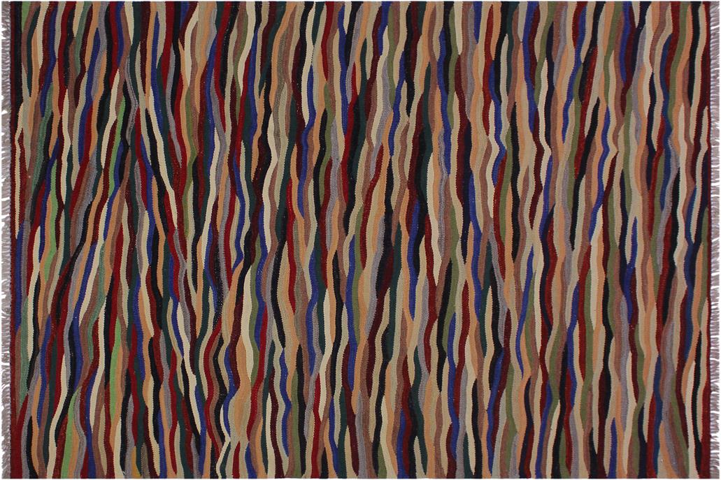 Elevate the elegance of your home with this stunning hand-woven tribal Kilim wool rug. Meticulously crafted on a loom by the Nomad Turkman people using hand-spun wool and 100% natural vegetable dyes, these rugs are recognized for their repetitive geometric patterns, incorporating naturalistic floral and traditional designs. The contemporary fashion palette results in bold, sharp patterns that are incredibly versatile, as the pattern is the same on both sides. These reversible rugs feature a lighter shade on one side and brighter colors on the other, providing versatility according to preference. These unique rugs are made by knotting short strands of different colors onto the warps and securing them by tightly pressing the wefts. The designs are created by interweaving the various colored wefts and warps. Kilims are known for their exceptional durability and versatility, making them truly unique rugs.
