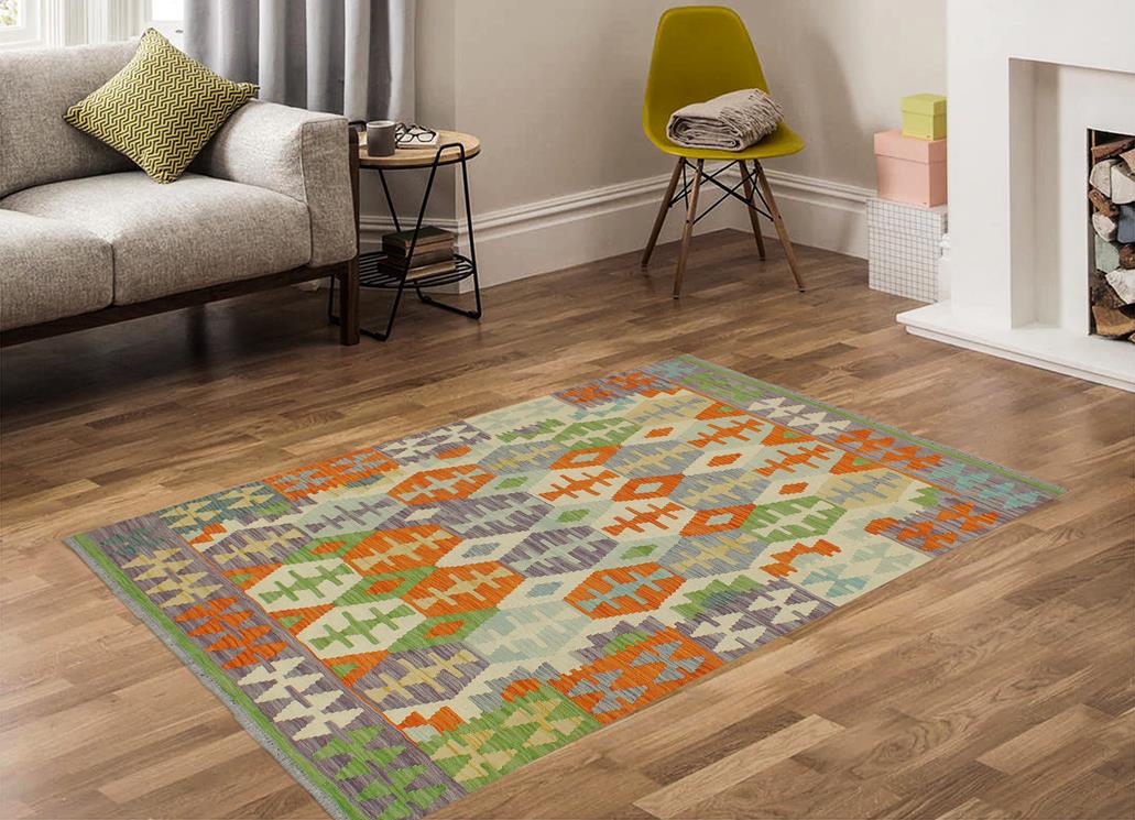 Elevate the elegance of your home with this stunning hand-woven tribal Kilim wool rug. Meticulously crafted on a loom by the Nomad Turkman people using hand-spun wool and 100% natural vegetable dyes, these rugs are recognized for their repetitive geometric patterns, incorporating naturalistic floral and traditional designs. The contemporary fashion palette results in bold, sharp patterns that are incredibly versatile, as the pattern is the same on both sides. These reversible rugs feature a lighter shade on one side and brighter colors on the other, providing versatility according to preference. These unique rugs are made by knotting short strands of different colors onto the warps and securing them by tightly pressing the wefts. The designs are created by interweaving the various colored wefts and warps. Kilims are known for their exceptional durability and versatility, making them truly unique rugs.
