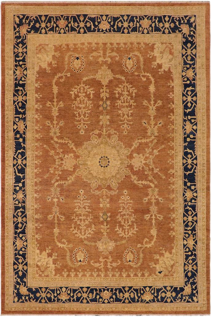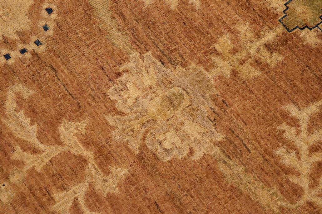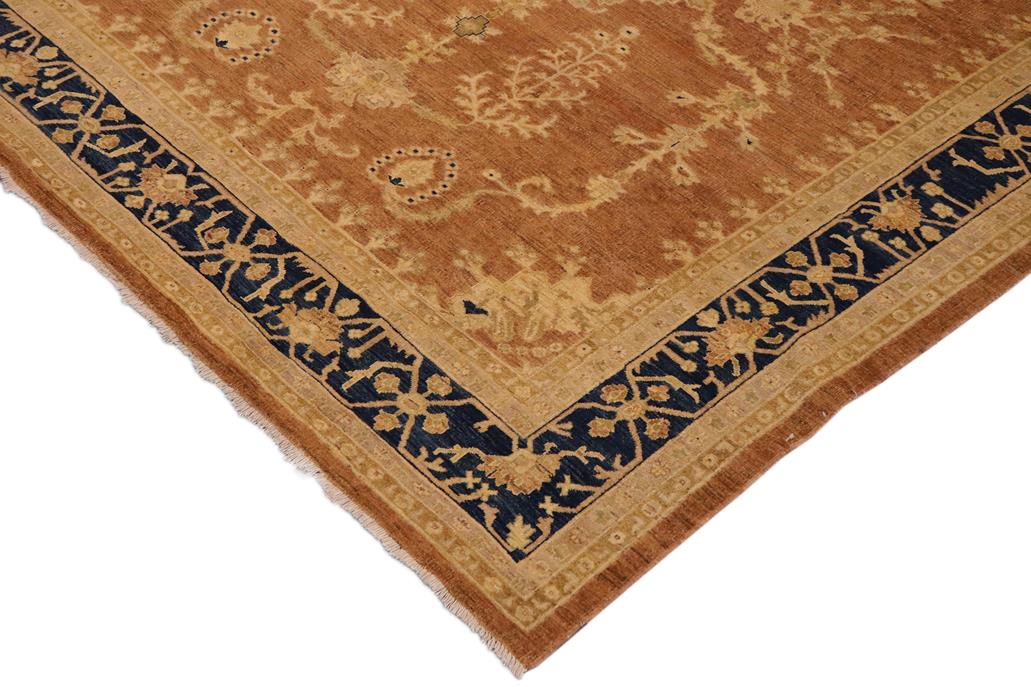 Enhance the ambiance of your home with this magnificent Persian-influenced Turkish hand-knotted rug made by skilled artisans capable of creating the most exceptional vegetable dyes and hand-spun wool. This exquisite handmade rug is a one-of-a-kind Peshawar Kafkaz, otherwise identified as Chobi, Chobi Peshawar, Oushak, or Ziegler rug. These handmade rugs are crafted in Pakistan utilizing superior-quality wool imported from Australia, New Zealand, and Korea in two types of weaves: the Persian weave and the Mori weave. This rug is meticulously crafted by hand using the finest natural vegetable dyes extracted from local plants. The artisans use a blend of hand-spun local and fine merino wool, resulting in a rug with a compelling texture, higher lanolin content, and longer staple. The artisans occasionally incorporate natural or artificial silk into the pile to enhance specific motifs. The finished product is an awe-inspiring flawless design execution and an understated palette that exudes elegance. Contemporary Peshawar rugs draw inspiration from antique Persian designs and feature modern design motifs with vibrant color tones. Hand-knotted with all-natural dyes, resulting in a unique abrash effect and subtle color variations in the pile. Peshawar rugs are known for their stunning and vibrant colors, which were achieved through a process inspired by antique methods. The rug's pile is meticulously trimmed to a moderate thickness and then stone-washed and sun-dried, resulting in a natural sheen and pleasing color tones. Transform the ambiance of your room into a luxurious haven with this gorgeous rug featuring a beautiful color palette. This stunning rug features an intricate oriental design that showcases royalty and seamlessly complements any decor. Its hand-knotted construction and natural fibers provide a soft and comfortable feel underfoot, making it the perfect addition to any room.