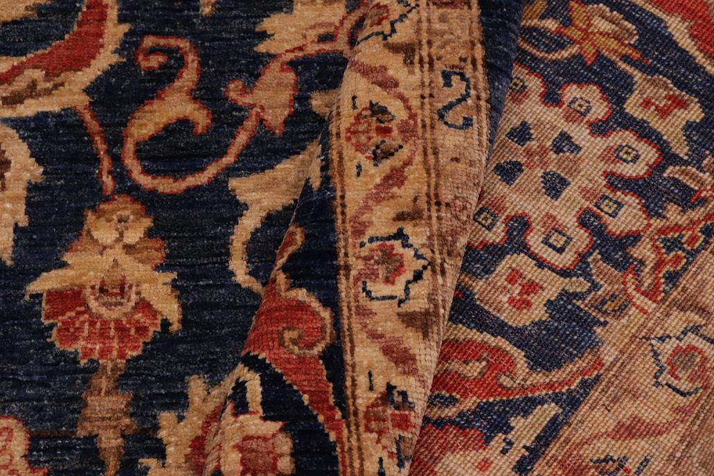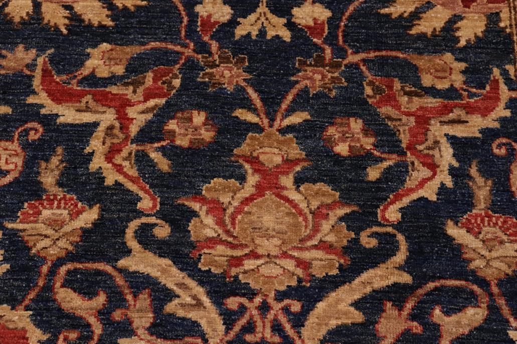 Enhance the ambiance of your home with this magnificent Persian-influenced Turkish hand-knotted rug made by skilled artisans capable of creating the most exceptional vegetable dyes and hand-spun wool. This exquisite handmade rug is a one-of-a-kind Peshawar Kafkaz, otherwise identified as Chobi, Chobi Peshawar, Oushak, or Ziegler rug. These handmade rugs are crafted in Pakistan utilizing superior-quality wool imported from Australia, New Zealand, and Korea in two types of weaves: the Persian weave and the Mori weave. This rug is meticulously crafted by hand using the finest natural vegetable dyes extracted from local plants. The artisans use a blend of hand-spun local and fine merino wool, resulting in a rug with a compelling texture, higher lanolin content, and longer staple. The artisans occasionally incorporate natural or artificial silk into the pile to enhance specific motifs. The finished product is an awe-inspiring flawless design execution and an understated palette that exudes elegance. Contemporary Peshawar rugs draw inspiration from antique Persian designs and feature modern design motifs with vibrant color tones. Hand-knotted with all-natural dyes, resulting in a unique abrash effect and subtle color variations in the pile. Peshawar rugs are known for their stunning and vibrant colors, which were achieved through a process inspired by antique methods. The rug's pile is meticulously trimmed to a moderate thickness and then stone-washed and sun-dried, resulting in a natural sheen and pleasing color tones. Transform the ambiance of your room into a luxurious haven with this gorgeous rug featuring a beautiful color palette. This stunning rug features an intricate oriental design that showcases royalty and seamlessly complements any decor. Its hand-knotted construction and natural fibers provide a soft and comfortable feel underfoot, making it the perfect addition to any room.