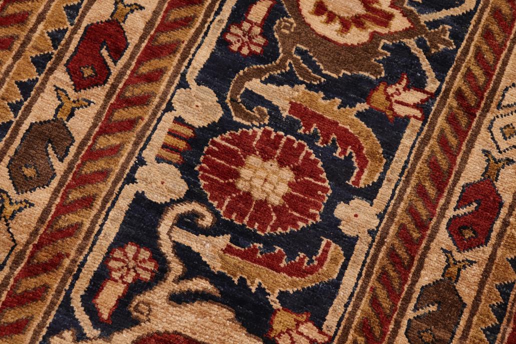 Enhance the ambiance of your home with this magnificent Persian-influenced Turkish hand-knotted rug made by skilled artisans capable of creating the most exceptional vegetable dyes and hand-spun wool. This exquisite handmade rug is a one-of-a-kind Peshawar Kafkaz, otherwise identified as Chobi, Chobi Peshawar, Oushak, or Ziegler rug. These handmade rugs are crafted in Pakistan utilizing superior-quality wool imported from Australia, New Zealand, and Korea in two types of weaves: the Persian weave and the Mori weave. This rug is meticulously crafted by hand using the finest natural vegetable dyes extracted from local plants. The artisans use a blend of hand-spun local and fine merino wool, resulting in a rug with a compelling texture, higher lanolin content, and longer staple. The artisans occasionally incorporate natural or artificial silk into the pile to enhance specific motifs. The finished product is an awe-inspiring flawless design execution and an understated palette that exudes elegance. Contemporary Peshawar rugs draw inspiration from antique Persian designs and feature modern design motifs with vibrant color tones. Hand-knotted with all-natural dyes, resulting in a unique abrash effect and subtle color variations in the pile. Peshawar rugs are known for their stunning and vibrant colors, which were achieved through a process inspired by antique methods. The rug's pile is meticulously trimmed to a moderate thickness and then stone-washed and sun-dried, resulting in a natural sheen and pleasing color tones. Transform the ambiance of your room into a luxurious haven with this gorgeous rug featuring a beautiful color palette. This stunning rug features an intricate oriental design that showcases royalty and seamlessly complements any decor. Its hand-knotted construction and natural fibers provide a soft and comfortable feel underfoot, making it the perfect addition to any room.