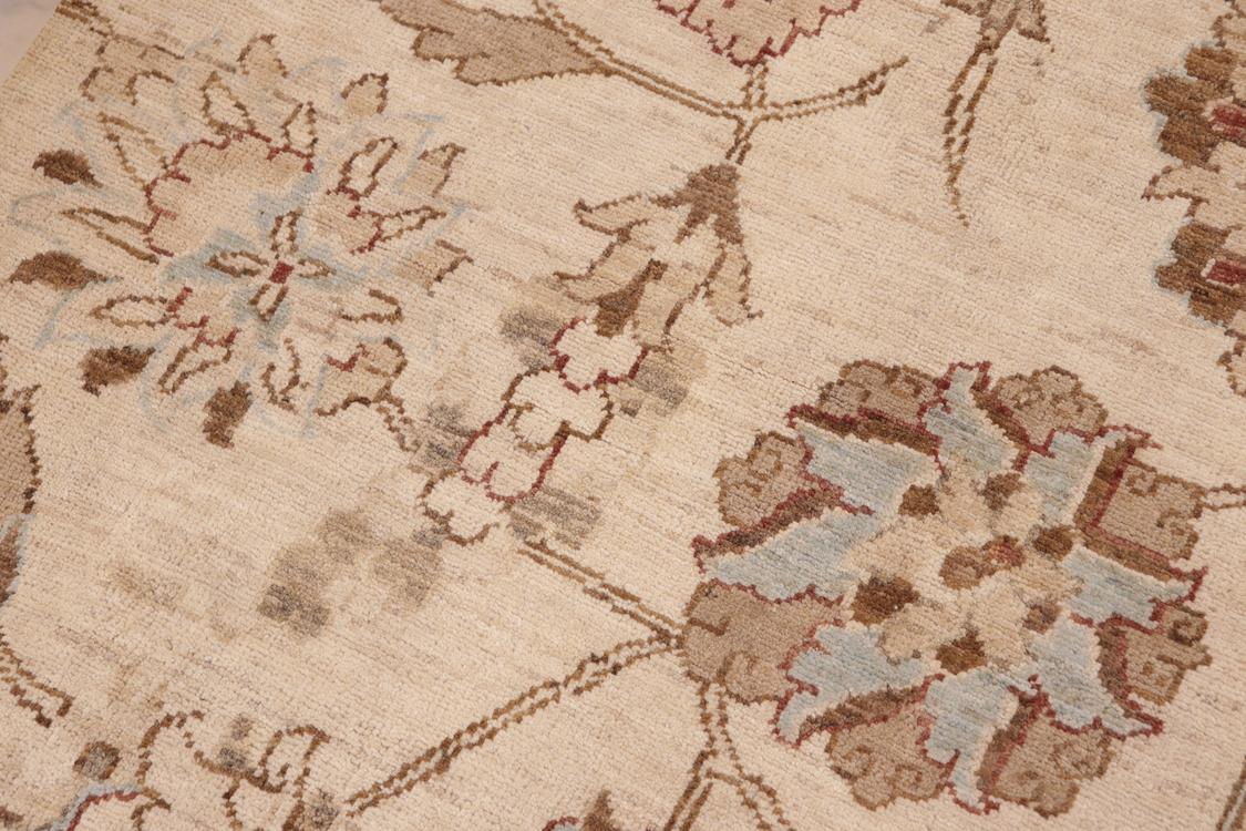 Enhance the ambiance of your home with this magnificent Persian-influenced Turkish hand-knotted rug made by skilled artisans capable of creating the most exceptional vegetable dyes and hand-spun wool. This exquisite handmade rug is a one-of-a-kind Peshawar Kafkaz, otherwise identified as Chobi, Chobi Peshawar, Oushak, or Ziegler rug. These handmade rugs are crafted in Pakistan utilizing superior-quality wool imported from Australia, New Zealand, and Korea in two types of weaves: the Persian weave and the Mori weave. This rug is meticulously crafted by hand using the finest natural vegetable dyes extracted from local plants. The artisans use a blend of hand-spun local and fine merino wool, resulting in a rug with a compelling texture, higher lanolin content, and longer staple. The artisans occasionally incorporate natural or artificial silk into the pile to enhance specific motifs. The finished product is an awe-inspiring flawless design execution and an understated palette that exudes elegance. Contemporary Peshawar rugs draw inspiration from antique Persian designs and feature modern design motifs with vibrant color tones. Hand-knotted with all-natural dyes, resulting in a unique abrash effect and subtle color variations in the pile. Peshawar rugs are known for their stunning and vibrant colors, which were achieved through a process inspired by antique methods. The rug's pile is meticulously trimmed to a moderate thickness and then stone-washed and sun-dried, resulting in a natural sheen and pleasing color tones. Transform the ambiance of your room into a luxurious haven with this gorgeous rug featuring a beautiful color palette. This stunning rug features an intricate oriental design that showcases royalty and seamlessly complements any decor. Its hand-knotted construction and natural fibers provide a soft and comfortable feel underfoot, making it the perfect addition to any room.