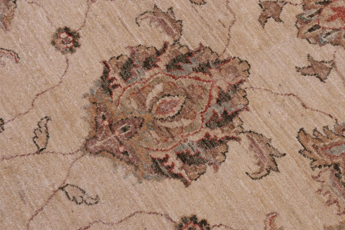 Enhance the ambiance of your home with this magnificent Persian-influenced Turkish hand-knotted rug made by skilled artisans capable of creating the most exceptional vegetable dyes and hand-spun wool. This exquisite handmade rug is a one-of-a-kind Peshawar Kafkaz, otherwise identified as Chobi, Chobi Peshawar, Oushak, or Ziegler rug. These handmade rugs are crafted in Pakistan utilizing superior-quality wool imported from Australia, New Zealand, and Korea in two types of weaves: the Persian weave and the Mori weave. This rug is meticulously crafted by hand using the finest natural vegetable dyes extracted from local plants. The artisans use a blend of hand-spun local and fine merino wool, resulting in a rug with a compelling texture, higher lanolin content, and longer staple. The artisans occasionally incorporate natural or artificial silk into the pile to enhance specific motifs. The finished product is an awe-inspiring flawless design execution and an understated palette that exudes elegance. Contemporary Peshawar rugs draw inspiration from antique Persian designs and feature modern design motifs with vibrant color tones. Hand-knotted with all-natural dyes, resulting in a unique abrash effect and subtle color variations in the pile. Peshawar rugs are known for their stunning and vibrant colors, which were achieved through a process inspired by antique methods. The rug's pile is meticulously trimmed to a moderate thickness and then stone-washed and sun-dried, resulting in a natural sheen and pleasing color tones. Transform the ambiance of your room into a luxurious haven with this gorgeous rug featuring a beautiful color palette. This stunning rug features an intricate oriental design that showcases royalty and seamlessly complements any decor. Its hand-knotted construction and natural fibers provide a soft and comfortable feel underfoot, making it the perfect addition to any room.
