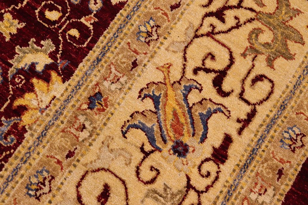 Enhance the ambiance of your home with this magnificent Persian-influenced Turkish hand-knotted rug made by skilled artisans capable of creating the most exceptional vegetable dyes and hand-spun wool. This exquisite handmade rug is a one-of-a-kind Peshawar Kafkaz, otherwise identified as Chobi, Chobi Peshawar, Oushak, or Ziegler rug. These handmade rugs are crafted in Pakistan utilizing superior-quality wool imported from Australia, New Zealand, and Korea in two types of weaves: the Persian weave and the Mori weave. This rug is meticulously crafted by hand using the finest natural vegetable dyes extracted from local plants. The artisans use a blend of hand-spun local and fine merino wool, resulting in a rug with a compelling texture, higher lanolin content, and longer staple. The artisans occasionally incorporate natural or artificial silk into the pile to enhance specific motifs. The finished product is an awe-inspiring execution of flawless design and an understated palette that exudes elegance. Contemporary Peshawar rugs draw inspiration from antique Persian designs and feature modern design motifs with vibrant color tones. Hand-knotted with all-natural dyes, resulting in a unique abrash effect and subtle color variations in the pile. Peshawar rugs are known for their stunning and vibrant colors, achieved through a process inspired by antique methods. The rug's pile is meticulously trimmed to a moderate thickness and then stone-washed and sun-dried, resulting in a natural sheen and pleasing color tones. Transform the ambiance of your room into a luxurious haven with this gorgeous rug featuring a beautiful color palette. This stunning rug features an intricate oriental design that showcases royalty and seamlessly complements any decor. Its hand-knotted construction and natural fibers provide a soft and comfortable feel underfoot, making it the perfect addition to any room.