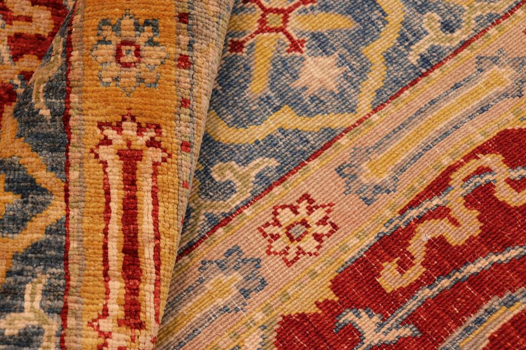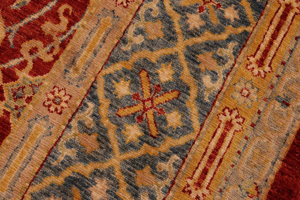 Enhance the ambiance of your home with this magnificent Persian-influenced Turkish hand-knotted rug made by skilled artisans capable of creating the most exceptional vegetable dyes and hand-spun wool. This exquisite handmade rug is a one-of-a-kind Peshawar Kafkaz, otherwise identified as Chobi, Chobi Peshawar, Oushak, or Ziegler rug. These handmade rugs are crafted in Pakistan utilizing superior-quality wool imported from Australia, New Zealand, and Korea in two types of weaves: the Persian weave and the Mori weave. This rug is meticulously crafted by hand using the finest natural vegetable dyes extracted from local plants. The artisans use a blend of hand-spun local and fine merino wool, resulting in a rug with a compelling texture, higher lanolin content, and longer staple. The artisans occasionally incorporate natural or artificial silk into the pile to enhance specific motifs. The finished product is an awe-inspiring execution of flawless design and an understated palette that exudes elegance. Contemporary Peshawar rugs draw inspiration from antique Persian designs and feature modern design motifs with vibrant color tones. Hand-knotted with all-natural dyes, resulting in a unique abrash effect and subtle color variations in the pile. Peshawar rugs are known for their stunning and vibrant colors, achieved through a process inspired by antique methods. The rug's pile is meticulously trimmed to a moderate thickness and then stone-washed and sun-dried, resulting in a natural sheen and pleasing color tones. Transform the ambiance of your room into a luxurious haven with this gorgeous rug featuring a beautiful color palette. This stunning rug features an intricate oriental design that showcases royalty and seamlessly complements any decor. Its hand-knotted construction and natural fibers provide a soft and comfortable feel underfoot, making it the perfect addition to any room.
