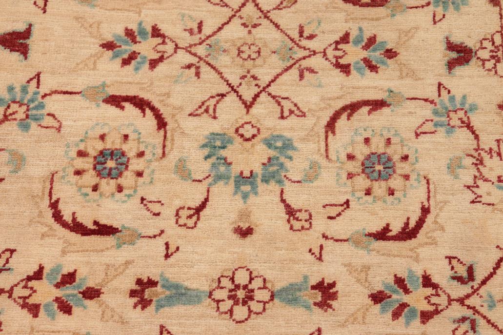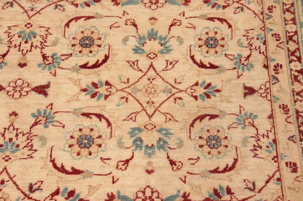 Enhance the ambiance of your home with this magnificent Persian-influenced Turkish hand-knotted rug made by skilled artisans capable of creating the most exceptional vegetable dyes and hand-spun wool. This exquisite handmade rug is a one-of-a-kind Peshawar Kafkaz, otherwise identified as Chobi, Chobi Peshawar, Oushak, or Ziegler rug. These handmade rugs are crafted in Pakistan utilizing superior-quality wool imported from Australia, New Zealand, and Korea in two types of weaves: the Persian weave and the Mori weave. This rug is meticulously crafted by hand using the finest natural vegetable dyes extracted from local plants. The artisans use a blend of hand-spun local and fine merino wool, resulting in a rug with a compelling texture, higher lanolin content, and longer staple. The artisans occasionally incorporate natural or artificial silk into the pile to enhance specific motifs. The finished product is an awe-inspiring execution of flawless design and an understated palette that exudes elegance. Contemporary Peshawar rugs draw inspiration from antique Persian designs and feature modern design motifs with vibrant color tones. Hand-knotted with all-natural dyes, resulting in a unique abrash effect and subtle color variations in the pile. Peshawar rugs are known for their stunning and vibrant colors, achieved through a process inspired by antique methods. The rug's pile is meticulously trimmed to a moderate thickness and then stone-washed and sun-dried, resulting in a natural sheen and pleasing color tones. Transform the ambiance of your room into a luxurious haven with this gorgeous rug featuring a beautiful color palette. This stunning rug features an intricate oriental design that showcases royalty and seamlessly complements any decor. Its hand-knotted construction and natural fibers provide a soft and comfortable feel underfoot, making it the perfect addition to any room.
