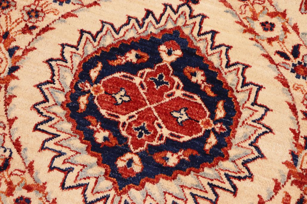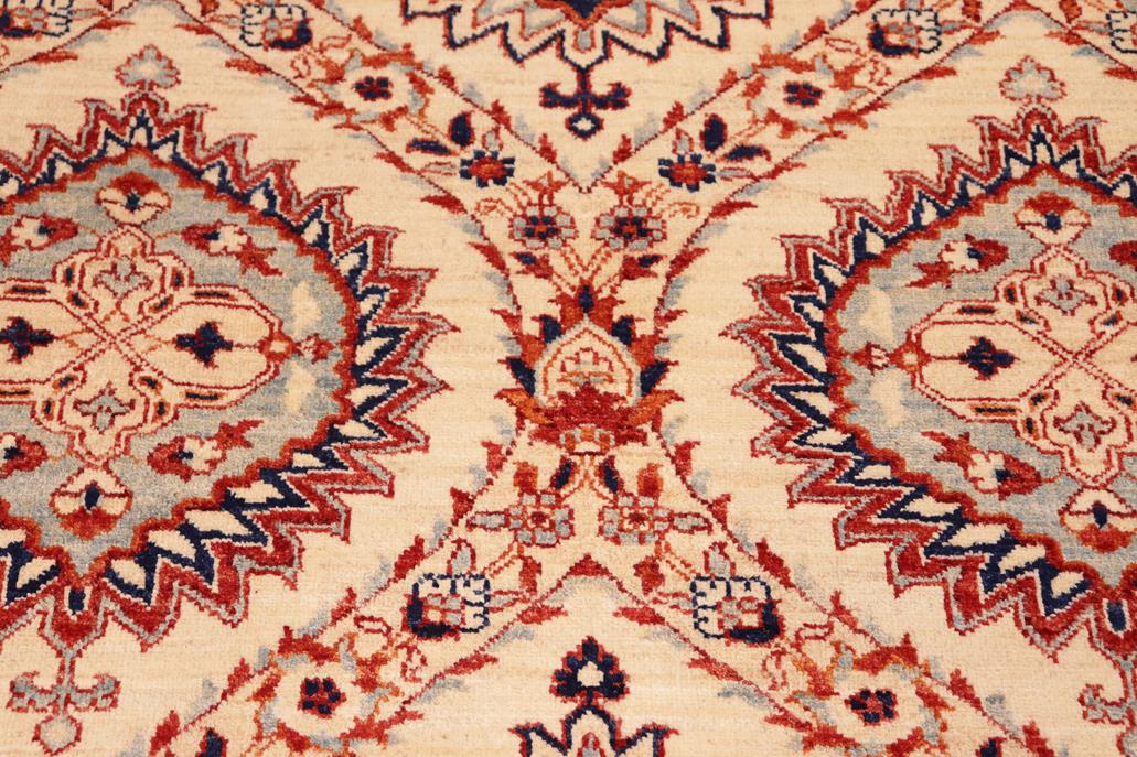 Enhance the ambiance of your home with this magnificent Persian-influenced Turkish hand-knotted rug made by skilled artisans capable of creating the most exceptional vegetable dyes and hand-spun wool. This exquisite handmade rug is a one-of-a-kind Peshawar Kafkaz, otherwise identified as Chobi, Chobi Peshawar, Oushak, or Ziegler rug. These handmade rugs are crafted in Pakistan utilizing superior-quality wool imported from Australia, New Zealand, and Korea in two types of weaves: the Persian weave and the Mori weave. This rug is meticulously crafted by hand using the finest natural vegetable dyes extracted from local plants. The artisans use a blend of hand-spun local and fine merino wool, resulting in a rug with a compelling texture, higher lanolin content, and longer staple. The artisans occasionally incorporate natural or artificial silk into the pile to enhance specific motifs. The finished product is an awe-inspiring execution of flawless design and an understated palette that exudes elegance. Contemporary Peshawar rugs draw inspiration from antique Persian designs and feature modern design motifs with vibrant color tones. Hand-knotted with all-natural dyes, resulting in a unique abrash effect and subtle color variations in the pile. Peshawar rugs are known for their stunning and vibrant colors, achieved through a process inspired by antique methods. The rug's pile is meticulously trimmed to a moderate thickness and then stone-washed and sun-dried, resulting in a natural sheen and pleasing color tones. Transform the ambiance of your room into a luxurious haven with this gorgeous rug featuring a beautiful color palette. This stunning rug features an intricate oriental design that showcases royalty and seamlessly complements any decor. Its hand-knotted construction and natural fibers provide a soft and comfortable feel underfoot, making it the perfect addition to any room.