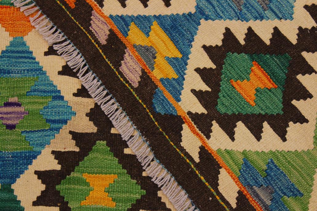 Elevate the elegance of your home with this stunning hand-woven tribal Kilim wool rug. Meticulously crafted on a loom by the Nomad Turkman people using hand-spun wool and 100% natural vegetable dyes, these rugs are recognized for their repetitive geometric patterns, incorporating naturalistic floral and traditional designs. The contemporary fashion palette results in bold, sharp patterns that are incredibly versatile, as the pattern is the same on both sides. These reversible rugs feature a lighter shade on one side and brighter colors on the other, providing versatility according to preference. These unique rugs are made by knotting short strands of different colors onto the warps and securing them by tightly pressing the wefts. The designs are created by interweaving the various colored wefts and warps. Kilims are known for their exceptional durability and versatility, making them truly unique rugs.