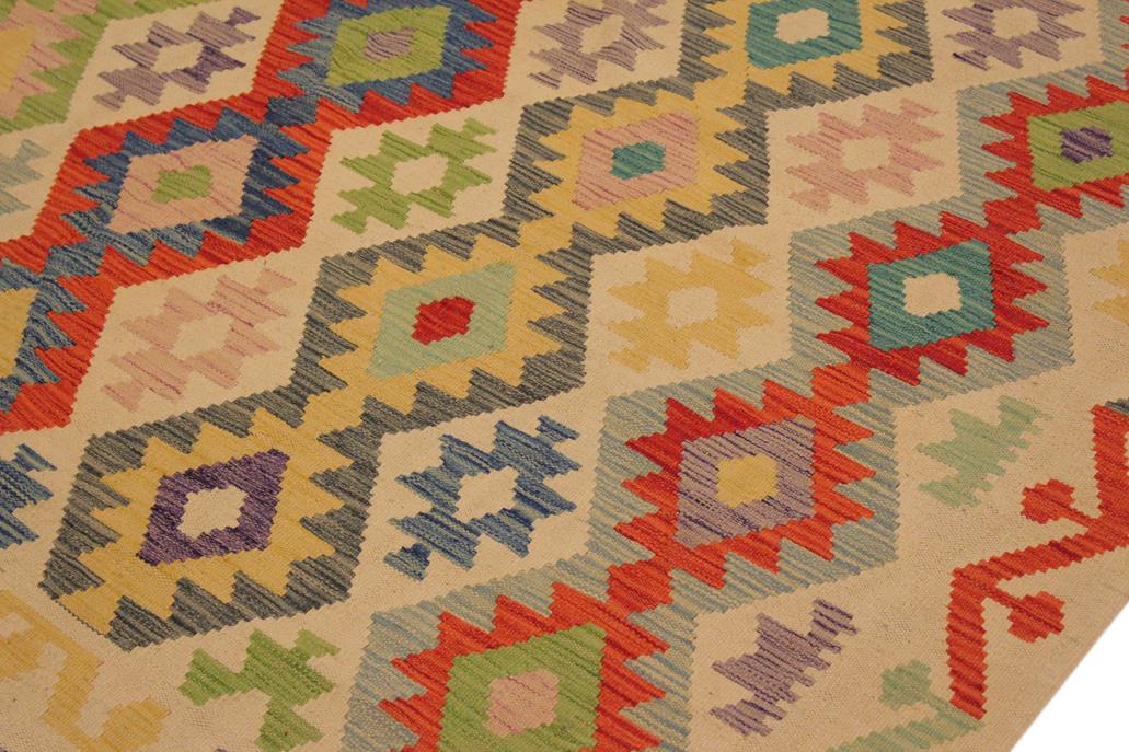 Elevate the elegance of your home with this stunning hand-woven tribal Kilim wool rug. Meticulously crafted on a loom by the Nomad Turkman people using hand-spun wool and 100% natural vegetable dyes, these rugs are recognized for their repetitive geometric patterns, incorporating naturalistic floral and traditional designs. The contemporary fashion palette results in bold, sharp patterns that are incredibly versatile, as the pattern is the same on both sides. These reversible rugs feature a lighter shade on one side and brighter colors on the other, providing versatility according to preference. These unique rugs are made by knotting short strands of different colors onto the warps and securing them by tightly pressing the wefts. The designs are created by interweaving the various colored wefts and warps. Kilims are known for their exceptional durability and versatility, making them truly unique rugs.