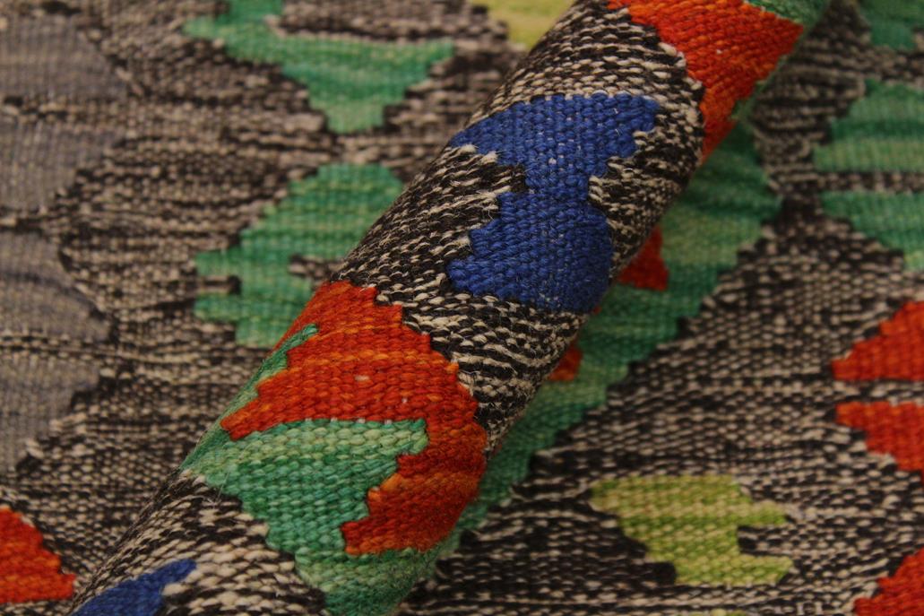 Elevate the elegance of your home with this stunning hand-woven tribal Kilim wool rug. Meticulously crafted on a loom by the Nomad Turkman people using hand-spun wool and 100% natural vegetable dyes, these rugs are recognized for their repetitive geometric patterns, incorporating naturalistic floral and traditional designs. The contemporary fashion palette results in bold, sharp patterns that are incredibly versatile, as the pattern is the same on both sides. These reversible rugs feature a lighter shade on one side and brighter colors on the other, providing versatility according to preference. These unique rugs are made by knotting short strands of different colors onto the warps and securing them by tightly pressing the wefts. The designs are created by interweaving the various colored wefts and warps. Kilims are known for their exceptional durability and versatility, making them truly unique rugs.