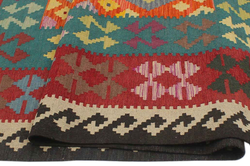 Elevate the elegance of your home with this stunning hand-woven tribal Kilim wool rug. Meticulously crafted on a loom by the Nomad Turkman people using hand-spun wool and 100% natural vegetable dyes, these rugs are recognized for their repetitive geometric patterns, incorporating naturalistic floral and traditional designs. The contemporary fashion palette results in bold, sharp patterns that are incredibly versatile, as the pattern is the same on both sides. These reversible rugs feature a lighter shade on one side and brighter colors on the other, providing versatility according to preference. These unique rugs are made by knotting short strands of different colors onto the warps and securing them by tightly pressing the wefts. The designs are created by interweaving the various colored wefts and warps. Kilims are known for their exceptional durability and versatility, making them truly unique rugs.