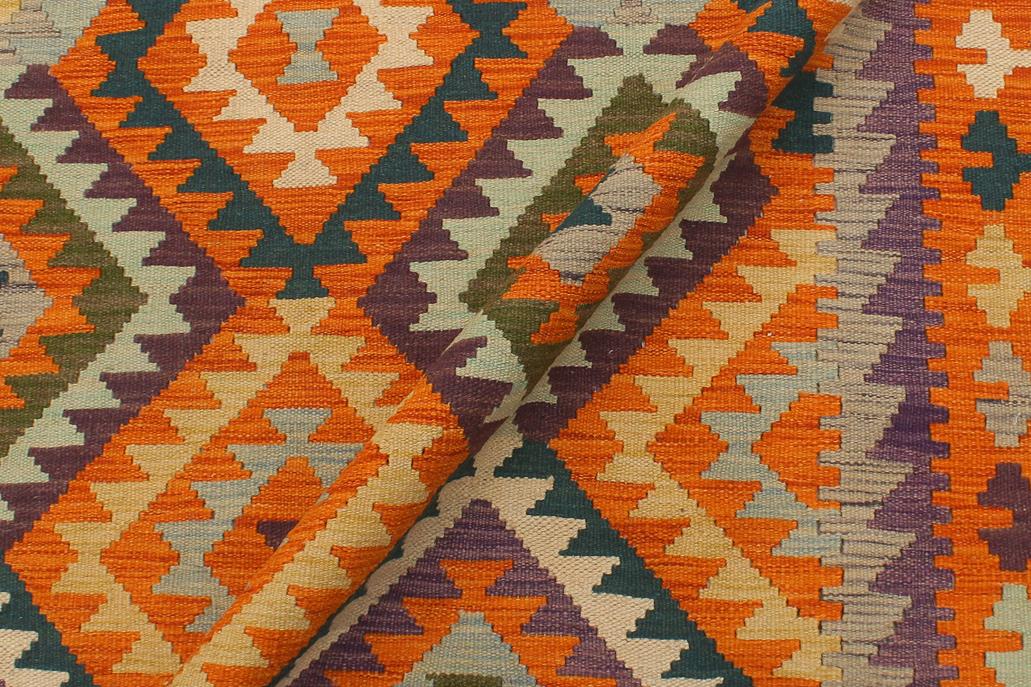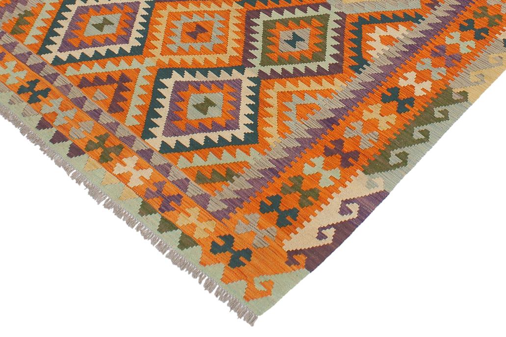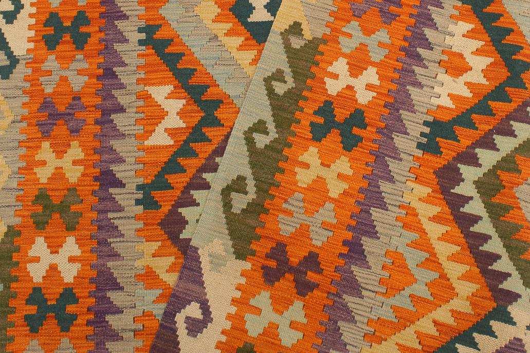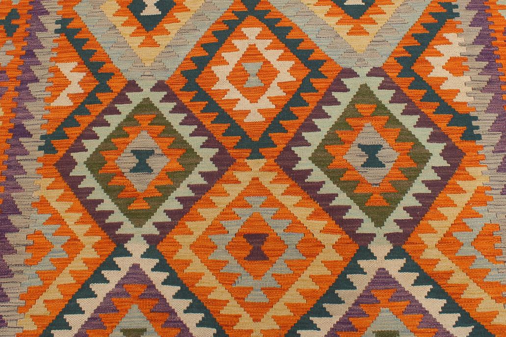 Elevate the elegance of your home with this stunning hand-woven tribal Kilim wool rug. Meticulously crafted on a loom by the Nomad Turkman people using hand-spun wool and 100% natural vegetable dyes, these rugs are recognized for their repetitive geometric patterns, incorporating naturalistic floral and traditional designs. The contemporary fashion palette results in bold, sharp patterns that are incredibly versatile, as the pattern is the same on both sides. These reversible rugs feature a lighter shade on one side and brighter colors on the other, providing versatility according to preference. These unique rugs are made by knotting short strands of different colors onto the warps and securing them by tightly pressing the wefts. The designs are created by interweaving the various colored wefts and warps. Kilims are known for their exceptional durability and versatility, making them truly unique rugs.