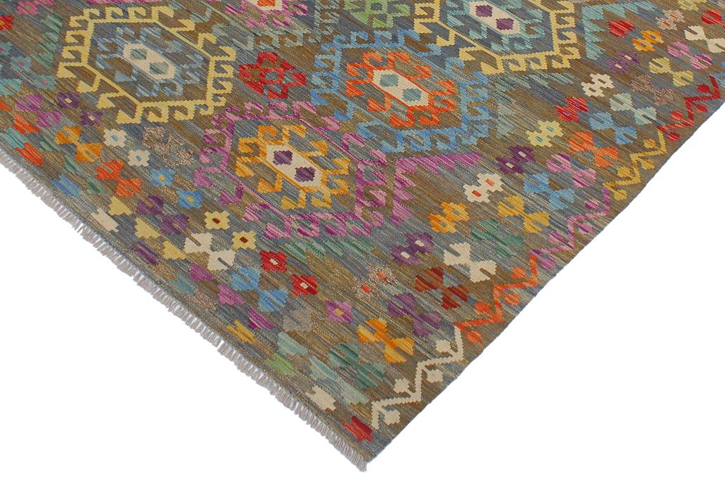 Elevate the elegance of your home with this stunning hand-woven tribal Kilim wool rug. Meticulously crafted on a loom by the Nomad Turkman people using hand-spun wool and 100% natural vegetable dyes, these rugs are recognized for their repetitive geometric patterns, incorporating naturalistic floral and traditional designs. The contemporary fashion palette results in bold, sharp patterns that are incredibly versatile, as the pattern is the same on both sides. These reversible rugs feature a lighter shade on one side and brighter colors on the other, providing versatility according to preference. These unique rugs are made by knotting short strands of different colors onto the warps and securing them by tightly pressing the wefts. The designs are created by interweaving the various colored wefts and warps. Kilims are known for their exceptional durability and versatility, making them truly unique rugs.