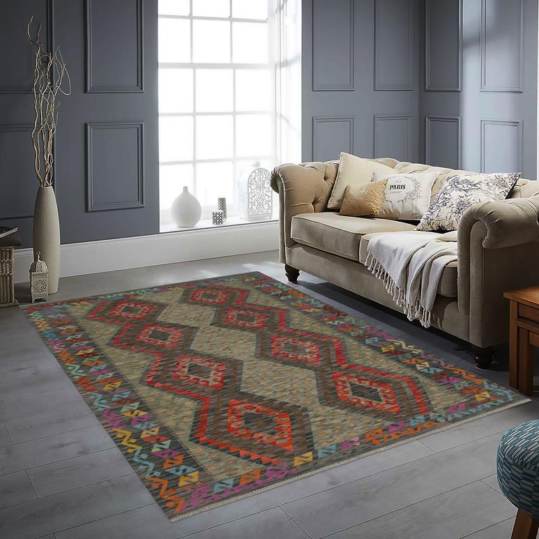 Elevate the elegance of your home with this stunning hand-woven tribal Kilim wool rug. Meticulously crafted on a loom by the Nomad Turkman people using hand-spun wool and 100% natural vegetable dyes, these rugs are recognized for their repetitive geometric patterns, incorporating naturalistic floral and traditional designs. The contemporary fashion palette results in bold, sharp patterns that are incredibly versatile, as the pattern is the same on both sides. These reversible rugs feature a lighter shade on one side and brighter colors on the other, providing versatility according to preference. These unique rugs are made by knotting short strands of different colors onto the warps and securing them by tightly pressing the wefts. The designs are created by interweaving the various colored wefts and warps. Kilims are known for their exceptional durability and versatility, making them truly unique rugs.