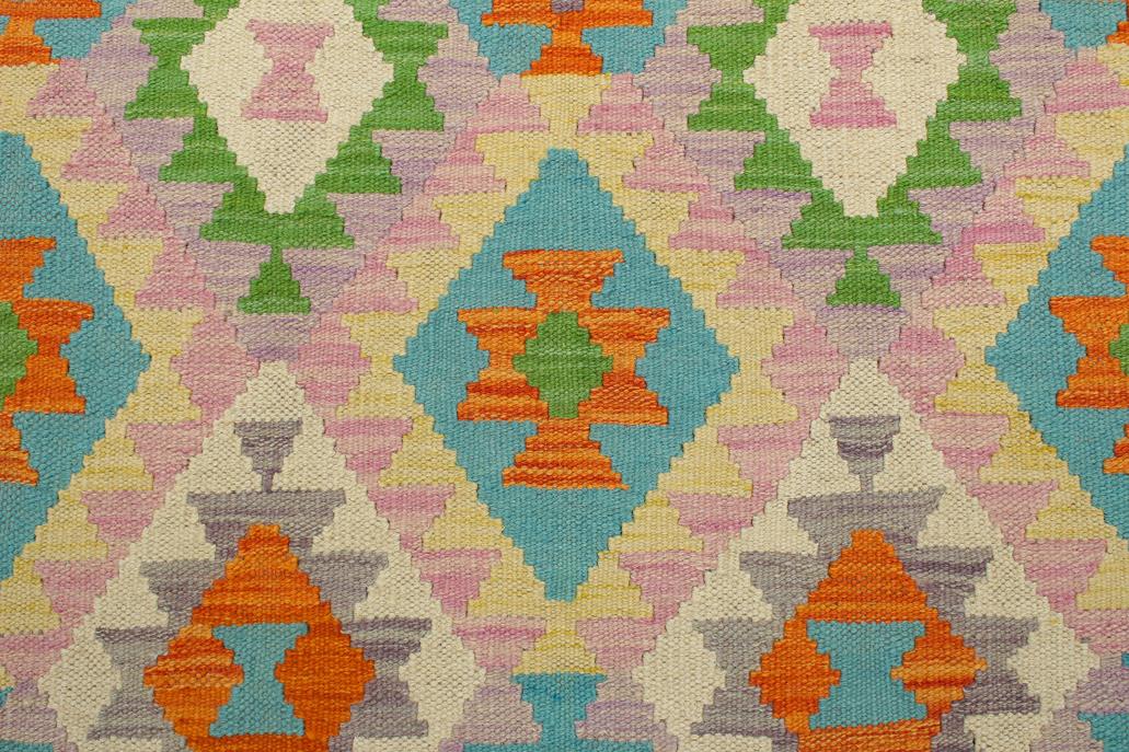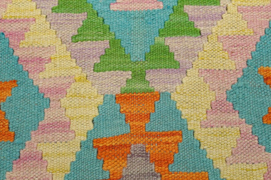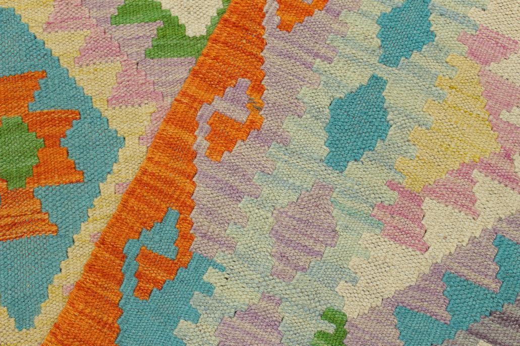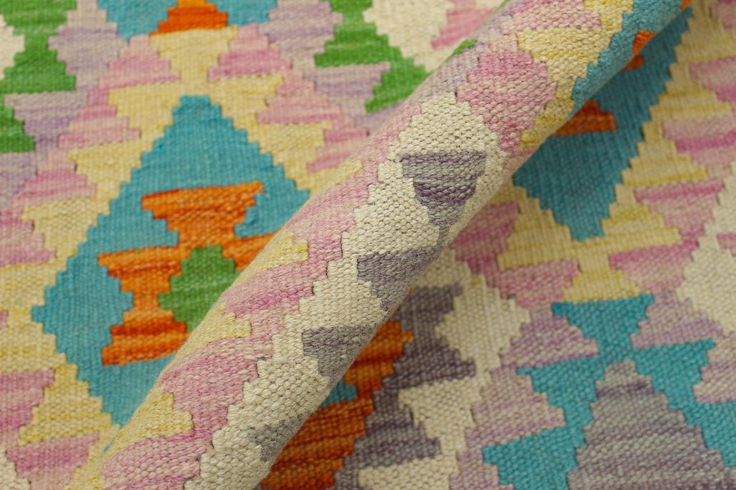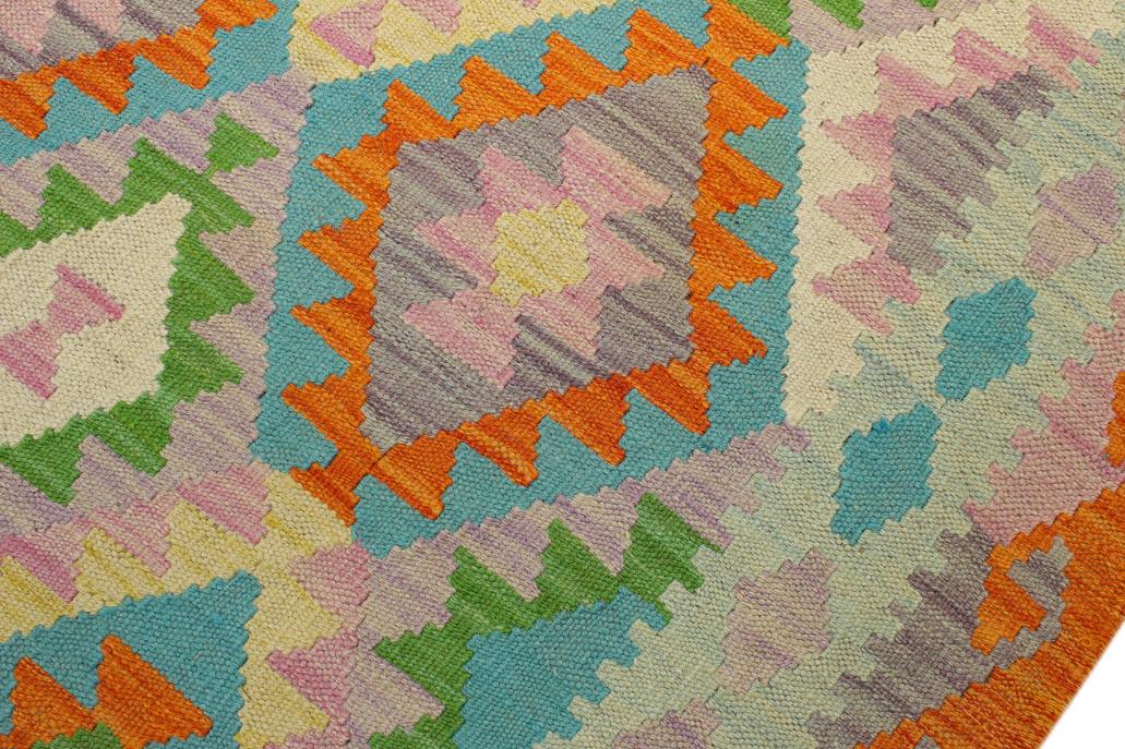 Elevate the elegance of your home with this stunning hand-woven tribal Kilim wool rug. Meticulously crafted on a loom by the Nomad Turkman people using hand-spun wool and 100% natural vegetable dyes, these rugs are recognized for their repetitive geometric patterns, incorporating naturalistic floral and traditional designs. The contemporary fashion palette results in bold, sharp patterns that are incredibly versatile, as the pattern is the same on both sides. These reversible rugs feature a lighter shade on one side and brighter colors on the other, providing versatility according to preference. These unique rugs are made by knotting short strands of different colors onto the warps and securing them by tightly pressing the wefts. The designs are created by interweaving the various colored wefts and warps. Kilims are known for their exceptional durability and versatility, making them truly unique rugs.