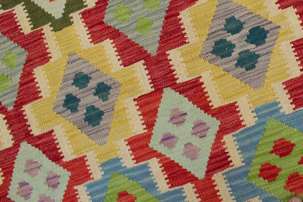 Elevate the elegance of your home with this stunning hand-woven tribal Kilim wool rug. Meticulously crafted on a loom by the Nomad Turkman people using hand-spun wool and 100% natural vegetable dyes, these rugs are recognized for their repetitive geometric patterns, incorporating naturalistic floral and traditional designs. The contemporary fashion palette results in bold, sharp patterns that are incredibly versatile, as the pattern is the same on both sides. These reversible rugs feature a lighter shade on one side and brighter colors on the other, providing versatility according to preference. These unique rugs are made by knotting short strands of different colors onto the warps and securing them by tightly pressing the wefts. The designs are created by interweaving the various colored wefts and warps. Kilims are known for their exceptional durability and versatility, making them truly unique rugs.
