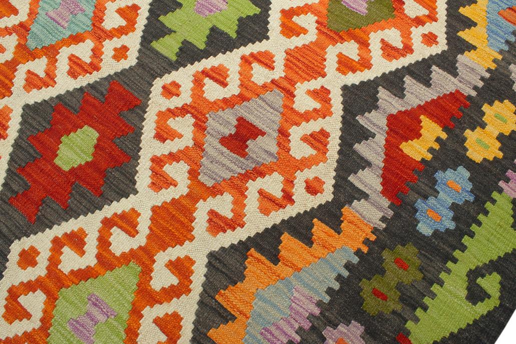 Elevate the elegance of your home with this stunning hand-woven tribal Kilim wool rug. Meticulously crafted on a loom by the Nomad Turkman people using hand-spun wool and 100% natural vegetable dyes, these rugs are recognized for their repetitive geometric patterns, incorporating naturalistic floral and traditional designs. The contemporary fashion palette results in bold, sharp patterns that are incredibly versatile, as the pattern is the same on both sides. These reversible rugs feature a lighter shade on one side and brighter colors on the other, providing versatility according to preference. These unique rugs are made by knotting short strands of different colors onto the warps and securing them by tightly pressing the wefts. The designs are created by interweaving the various colored wefts and warps. Kilims are known for their exceptional durability and versatility, making them truly unique rugs.