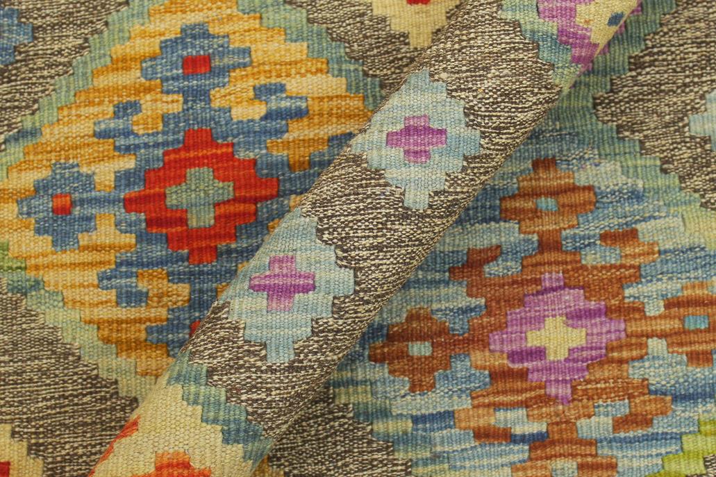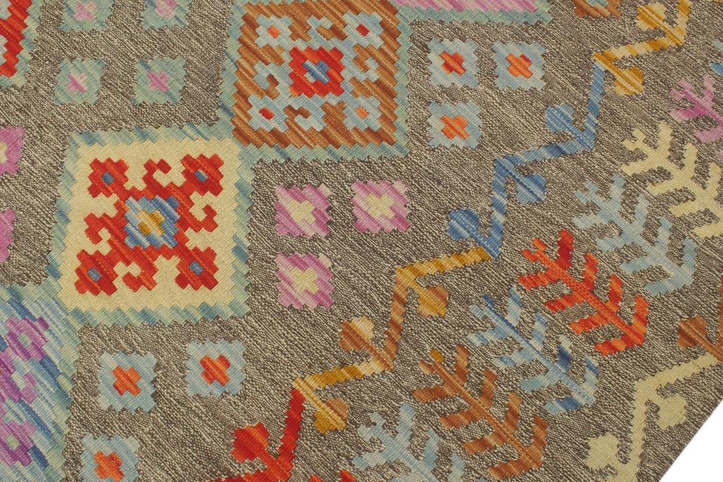 Elevate the elegance of your home with this stunning hand-woven tribal Kilim wool rug. Meticulously crafted on a loom by the Nomad Turkman people using hand-spun wool and 100% natural vegetable dyes, these rugs are recognized for their repetitive geometric patterns, incorporating naturalistic floral and traditional designs. The contemporary fashion palette results in bold, sharp patterns that are incredibly versatile, as the pattern is the same on both sides. These reversible rugs feature a lighter shade on one side and brighter colors on the other, providing versatility according to preference. These unique rugs are made by knotting short strands of different colors onto the warps and securing them by tightly pressing the wefts. The designs are created by interweaving the various colored wefts and warps. Kilims are known for their exceptional durability and versatility, making them truly unique rugs.