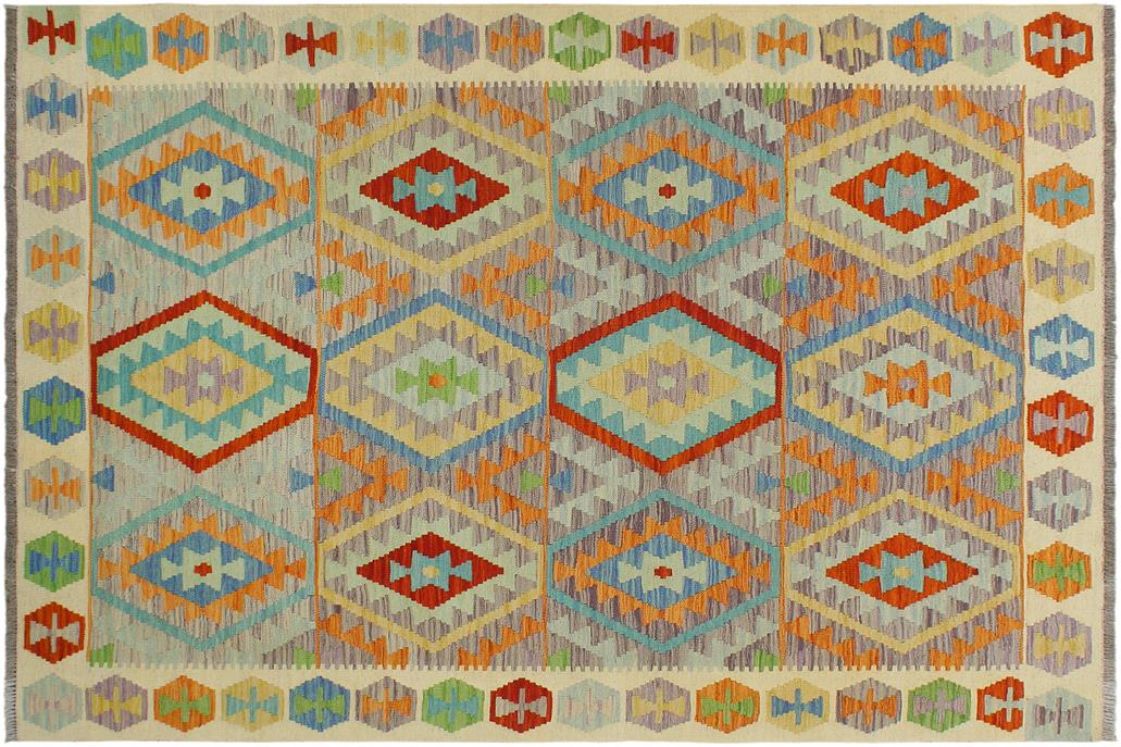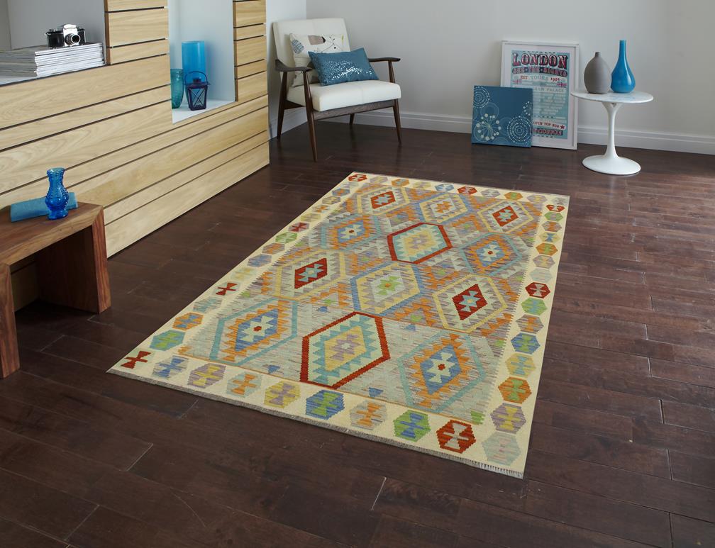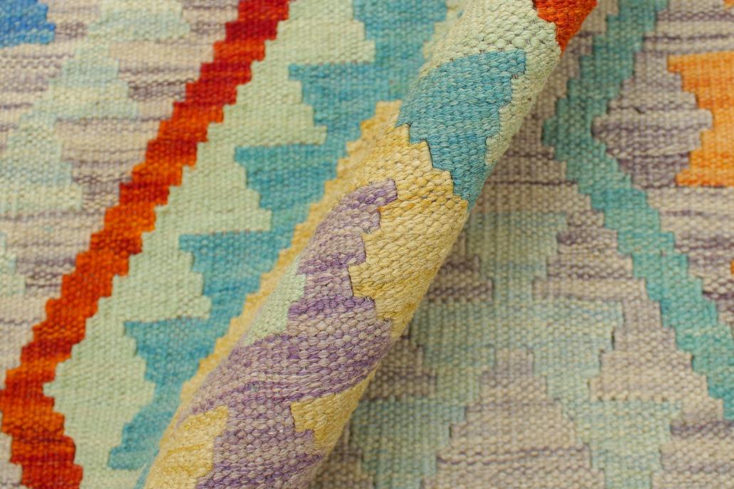 Elevate the elegance of your home with this stunning hand-woven tribal Kilim wool rug. Meticulously crafted on a loom by the Nomad Turkman people using hand-spun wool and 100% natural vegetable dyes, these rugs are recognized for their repetitive geometric patterns, incorporating naturalistic floral and traditional designs. The contemporary fashion palette results in bold, sharp patterns that are incredibly versatile, as the pattern is the same on both sides. These reversible rugs feature a lighter shade on one side and brighter colors on the other, providing versatility according to preference. These unique rugs are made by knotting short strands of different colors onto the warps and securing them by tightly pressing the wefts. The designs are created by interweaving the various colored wefts and warps. Kilims are known for their exceptional durability and versatility, making them truly unique rugs.