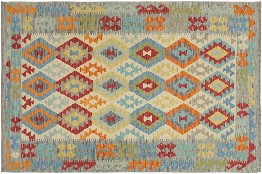 Elevate the elegance of your home with this stunning hand-woven tribal Kilim wool rug. Meticulously crafted on a loom by the Nomad Turkman people using hand-spun wool and 100% natural vegetable dyes, these rugs are recognized for their repetitive geometric patterns, incorporating naturalistic floral and traditional designs. The contemporary fashion palette results in bold, sharp patterns that are incredibly versatile, as the pattern is the same on both sides. These reversible rugs feature a lighter shade on one side and brighter colors on the other, providing versatility according to preference. These unique rugs are made by knotting short strands of different colors onto the warps and securing them by tightly pressing the wefts. The designs are created by interweaving the various colored wefts and warps. Kilims are known for their exceptional durability and versatility, making them truly unique rugs.