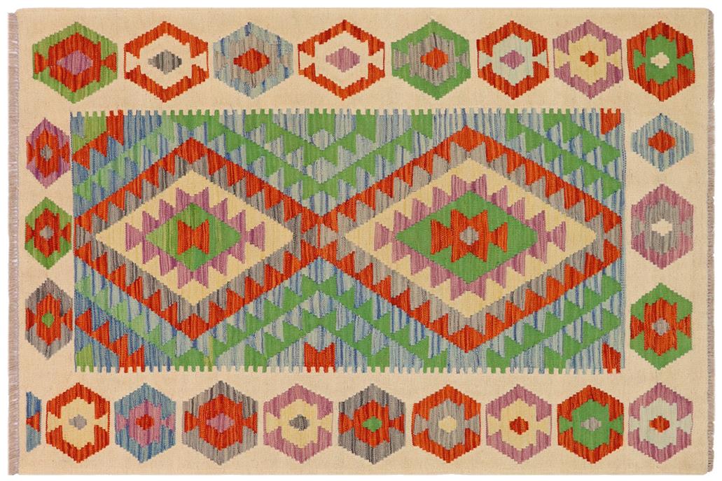 Elevate the elegance of your home with this stunning hand-woven tribal Kilim wool rug. Meticulously crafted on a loom by the Nomad Turkman people using hand-spun wool and 100% natural vegetable dyes, these rugs are recognized for their repetitive geometric patterns, incorporating naturalistic floral and traditional designs. The contemporary fashion palette results in bold, sharp patterns that are incredibly versatile, as the pattern is the same on both sides. These reversible rugs feature a lighter shade on one side and brighter colors on the other, providing versatility according to preference. These unique rugs are made by knotting short strands of different colors onto the warps and securing them by tightly pressing the wefts. The designs are created by interweaving the various colored wefts and warps. Kilims are known for their exceptional durability and versatility, making them truly unique rugs.