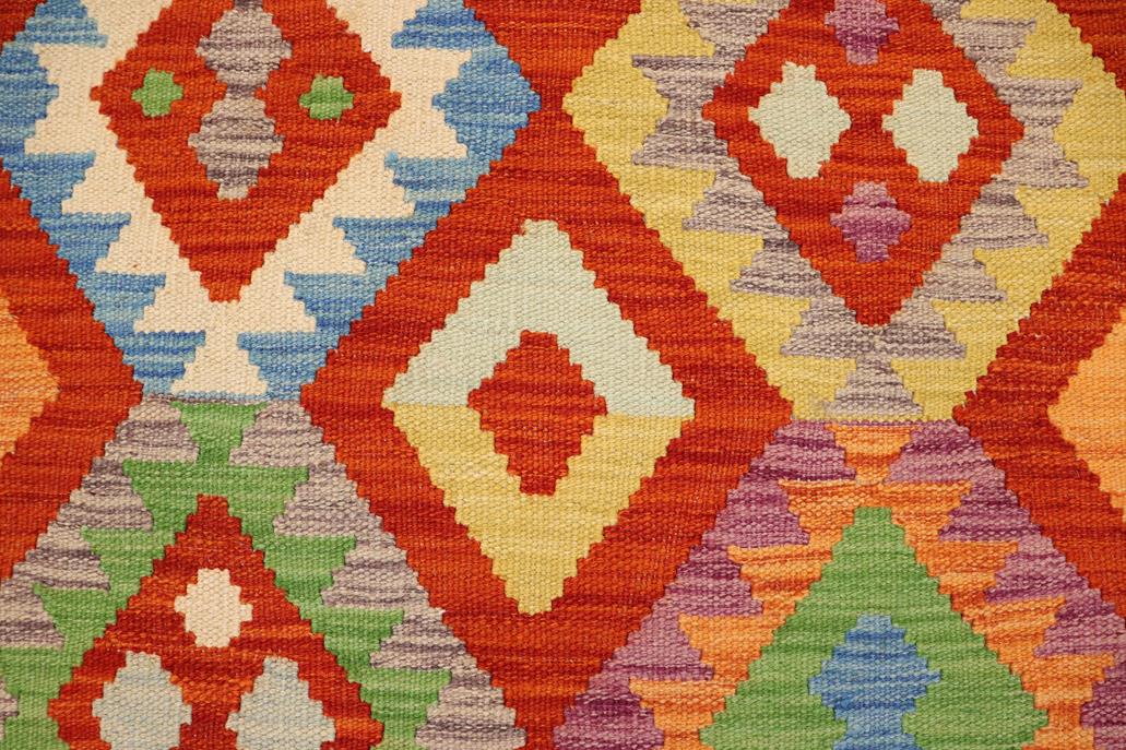 Elevate the elegance of your home with this stunning hand-woven tribal Kilim wool rug. Meticulously crafted on a loom by the Nomad Turkman people using hand-spun wool and 100% natural vegetable dyes, these rugs are recognized for their repetitive geometric patterns, incorporating naturalistic floral and traditional designs. The contemporary fashion palette results in bold, sharp patterns that are incredibly versatile, as the pattern is the same on both sides. These reversible rugs feature a lighter shade on one side and brighter colors on the other, providing versatility according to preference. These unique rugs are made by knotting short strands of different colors onto the warps and securing them by tightly pressing the wefts. The designs are created by interweaving the various colored wefts and warps. Kilims are known for their exceptional durability and versatility, making them truly unique rugs.