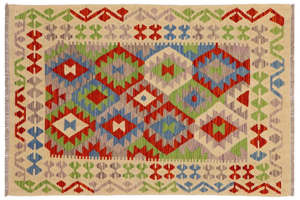 Elevate the elegance of your home with this stunning hand-woven tribal Kilim wool rug. Meticulously crafted on a loom by the Nomad Turkman people using hand-spun wool and 100% natural vegetable dyes, these rugs are recognized for their repetitive geometric patterns, incorporating naturalistic floral and traditional designs. The contemporary fashion palette results in bold, sharp patterns that are incredibly versatile, as the pattern is the same on both sides. These reversible rugs feature a lighter shade on one side and brighter colors on the other, providing versatility according to preference. These unique rugs are made by knotting short strands of different colors onto the warps and securing them by tightly pressing the wefts. The designs are created by interweaving the various colored wefts and warps. Kilims are known for their exceptional durability and versatility, making them truly unique rugs.