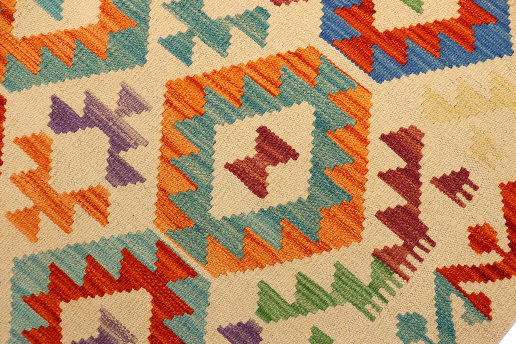 Elevate the elegance of your home with this stunning hand-woven tribal Kilim wool rug. Meticulously crafted on a loom by the Nomad Turkman people using hand-spun wool and 100% natural vegetable dyes, these rugs are recognized for their repetitive geometric patterns, incorporating naturalistic floral and traditional designs. The contemporary fashion palette results in bold, sharp patterns that are incredibly versatile, as the pattern is the same on both sides. These reversible rugs feature a lighter shade on one side and brighter colors on the other, providing versatility according to preference. These unique rugs are made by knotting short strands of different colors onto the warps and securing them by tightly pressing the wefts. The designs are created by interweaving the various colored wefts and warps. Kilims are known for their exceptional durability and versatility, making them truly unique rugs.