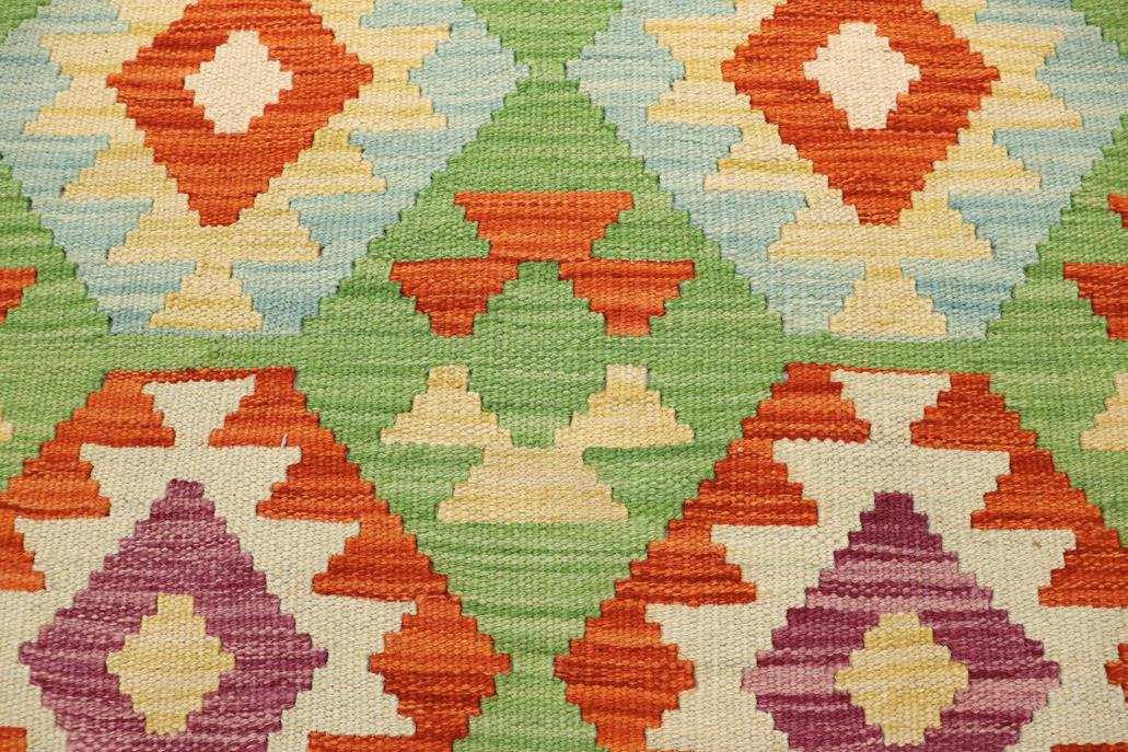 Elevate the elegance of your home with this stunning hand-woven tribal Kilim wool rug. Meticulously crafted on a loom by the Nomad Turkman people using hand-spun wool and 100% natural vegetable dyes, these rugs are recognized for their repetitive geometric patterns, incorporating naturalistic floral and traditional designs. The contemporary fashion palette results in bold, sharp patterns that are incredibly versatile, as the pattern is the same on both sides. These reversible rugs feature a lighter shade on one side and brighter colors on the other, providing versatility according to preference. These unique rugs are made by knotting short strands of different colors onto the warps and securing them by tightly pressing the wefts. The designs are created by interweaving the various colored wefts and warps. Kilims are known for their exceptional durability and versatility, making them truly unique rugs.