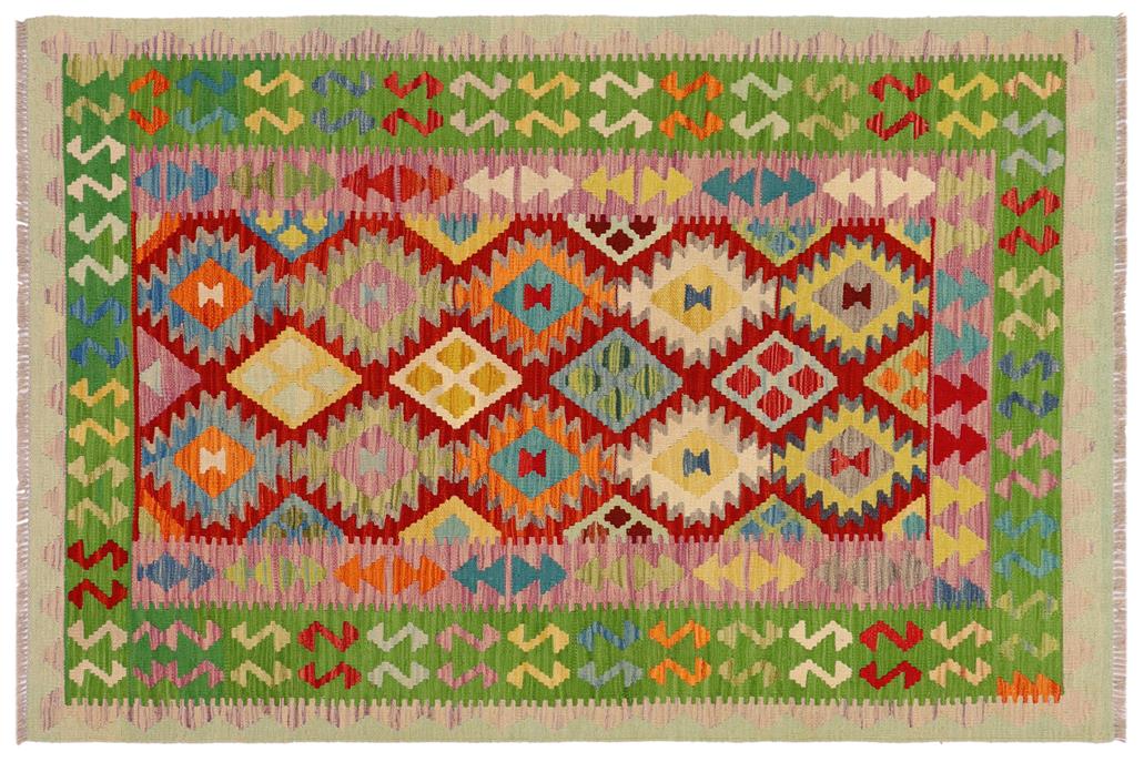 Elevate the elegance of your home with this stunning hand-woven tribal Kilim wool rug. Meticulously crafted on a loom by the Nomad Turkman people using hand-spun wool and 100% natural vegetable dyes, these rugs are recognized for their repetitive geometric patterns, incorporating naturalistic floral and traditional designs. The contemporary fashion palette results in bold, sharp patterns that are incredibly versatile, as the pattern is the same on both sides. These reversible rugs feature a lighter shade on one side and brighter colors on the other, providing versatility according to preference. These unique rugs are made by knotting short strands of different colors onto the warps and securing them by tightly pressing the wefts. The designs are created by interweaving the various colored wefts and warps. Kilims are known for their exceptional durability and versatility, making them truly unique rugs.