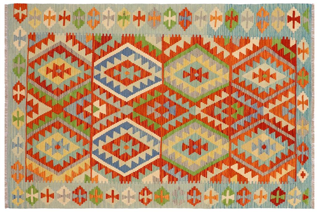 Elevate the elegance of your home with this stunning hand-woven tribal Kilim wool rug. Meticulously crafted on a loom by the Nomad Turkman people using hand-spun wool and 100% natural vegetable dyes, these rugs are recognized for their repetitive geometric patterns, incorporating naturalistic floral and traditional designs. The contemporary fashion palette results in bold, sharp patterns that are incredibly versatile, as the pattern is the same on both sides. These reversible rugs feature a lighter shade on one side and brighter colors on the other, providing versatility according to preference. These unique rugs are made by knotting short strands of different colors onto the warps and securing them by tightly pressing the wefts. The designs are created by interweaving the various colored wefts and warps. Kilims are known for their exceptional durability and versatility, making them truly unique rugs.