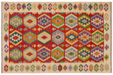 Elevate the elegance of your home with this stunning hand-woven tribal Kilim wool rug. Meticulously crafted on a loom by the Nomad Turkman people using hand-spun wool and 100% natural vegetable dyes, these rugs are recognized for their repetitive geometric patterns, incorporating naturalistic floral and traditional designs. The contemporary fashion palette results in bold, sharp patterns that are incredibly versatile, as the pattern is the same on both sides. These reversible rugs feature a lighter shade on one side and brighter colors on the other, providing versatility according to preference. These unique rugs are made by knotting short strands of different colors onto the warps and securing them by tightly pressing the wefts. The designs are created by interweaving the various colored wefts and warps. Kilims are known for their exceptional durability and versatility, making them truly unique rugs.