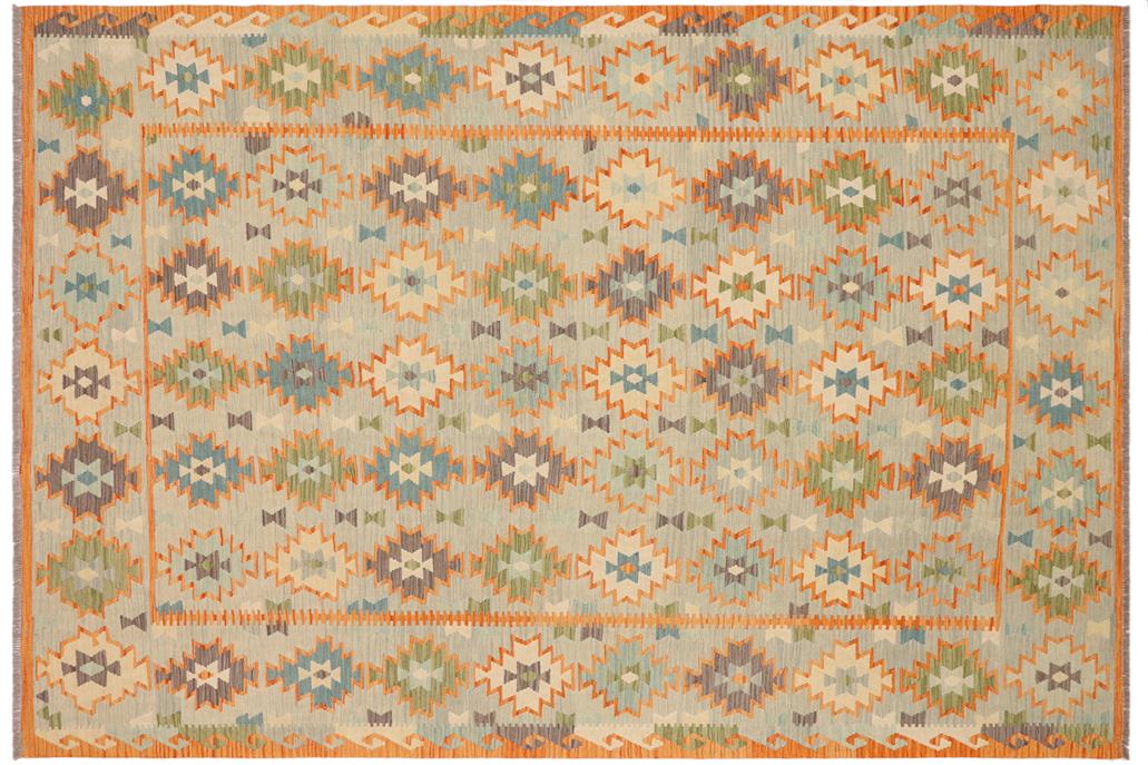 Elevate the elegance of your home with this stunning hand-woven tribal Kilim wool rug. Meticulously crafted on a loom by the Nomad Turkman people using hand-spun wool and 100% natural vegetable dyes, these rugs are recognized for their repetitive geometric patterns, incorporating naturalistic floral and traditional designs. The contemporary fashion palette results in bold, sharp patterns that are incredibly versatile, as the pattern is the same on both sides. These reversible rugs feature a lighter shade on one side and brighter colors on the other, providing versatility according to preference. These unique rugs are made by knotting short strands of different colors onto the warps and securing them by tightly pressing the wefts. The designs are created by interweaving the various colored wefts and warps. Kilims are known for their exceptional durability and versatility, making them truly unique rugs.