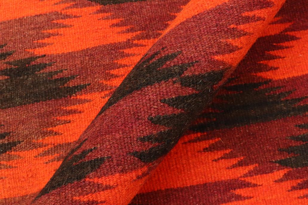 Elevate the elegance of your home with this stunning hand-woven tribal Kilim wool rug. Meticulously crafted on a loom by the Nomad Turkman people using hand-spun wool and 100% natural vegetable dyes, these rugs are recognized for their repetitive geometric patterns, incorporating naturalistic floral and traditional designs. The contemporary fashion palette results in bold, sharp patterns that are incredibly versatile, as the pattern is the same on both sides. These reversible rugs feature a lighter shade on one side and brighter colors on the other, providing versatility according to preference. These unique rugs are made by knotting short strands of different colors onto the warps and securing them by tightly pressing the wefts. The designs are created by interweaving the various colored wefts and warps. Kilims are known for their exceptional durability and versatility, making them truly unique rugs.