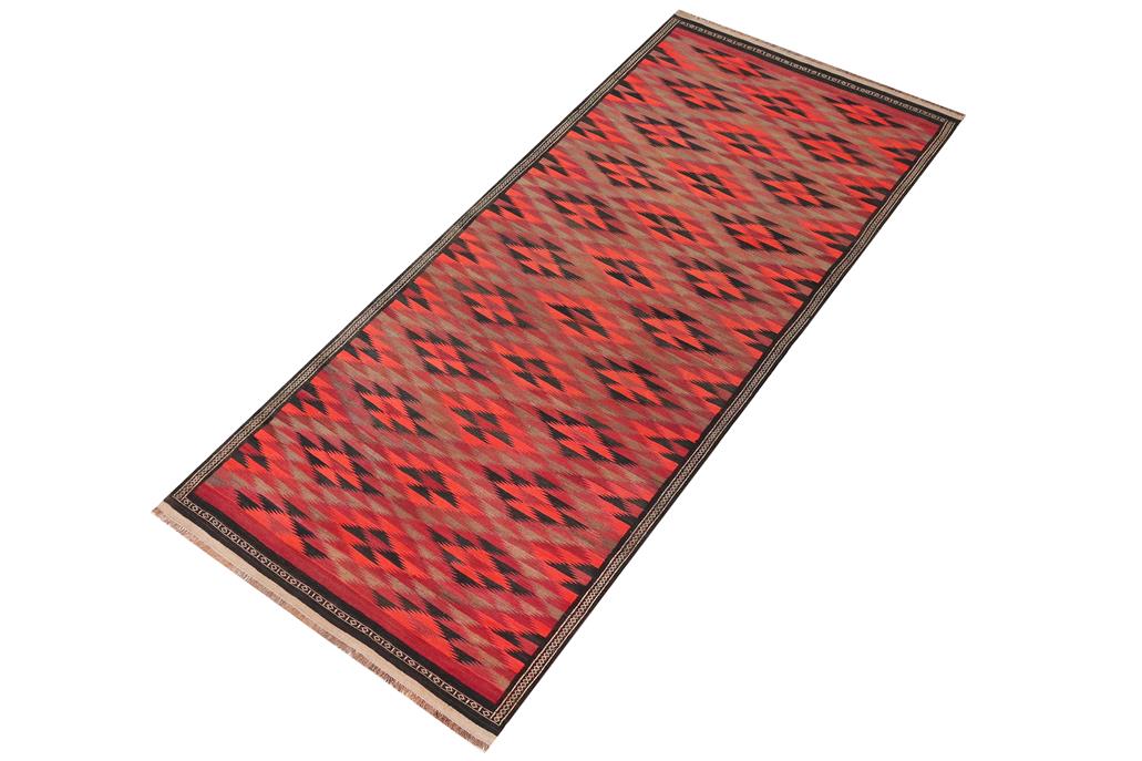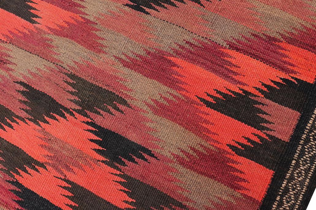 Elevate the elegance of your home with this stunning hand-woven tribal Kilim wool rug. Meticulously crafted on a loom by the Nomad Turkman people using hand-spun wool and 100% natural vegetable dyes, these rugs are recognized for their repetitive geometric patterns, incorporating naturalistic floral and traditional designs. The contemporary fashion palette results in bold, sharp patterns that are incredibly versatile, as the pattern is the same on both sides. These reversible rugs feature a lighter shade on one side and brighter colors on the other, providing versatility according to preference. These unique rugs are made by knotting short strands of different colors onto the warps and securing them by tightly pressing the wefts. The designs are created by interweaving the various colored wefts and warps. Kilims are known for their exceptional durability and versatility, making them truly unique rugs.