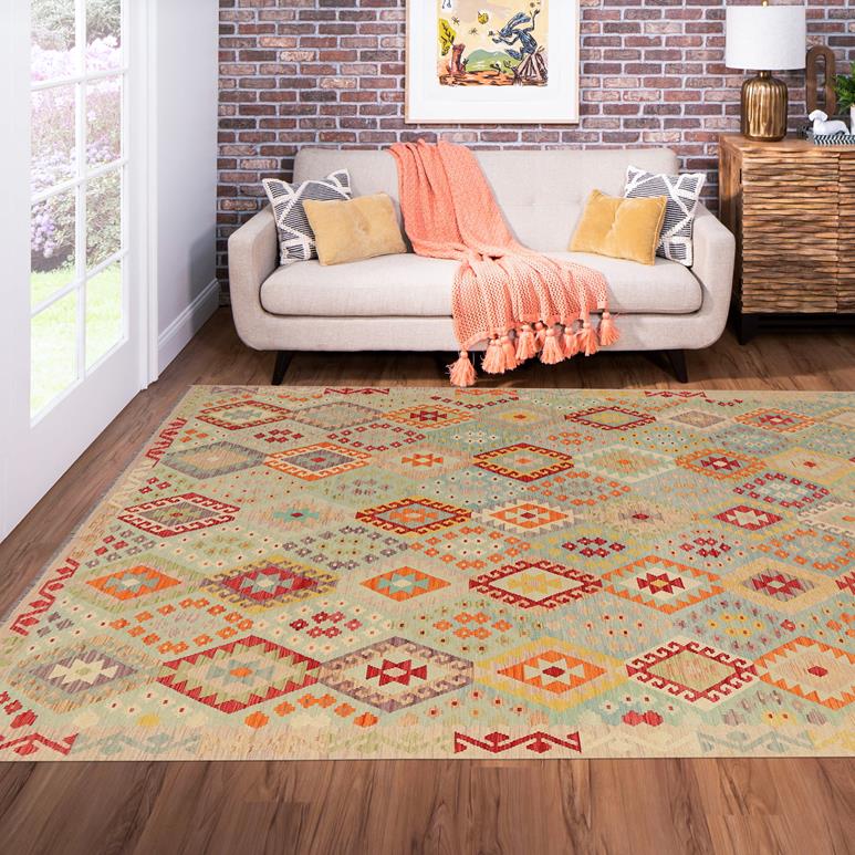 Elevate the elegance of your home with this stunning hand-woven tribal Kilim wool rug. Meticulously crafted on a loom by the Nomad Turkman people using hand-spun wool and 100% natural vegetable dyes, these rugs are recognized for their repetitive geometric patterns, incorporating naturalistic floral and traditional designs. The contemporary fashion palette results in bold, sharp patterns that are incredibly versatile, as the pattern is the same on both sides. These reversible rugs feature a lighter shade on one side and brighter colors on the other, providing versatility according to preference. These unique rugs are made by knotting short strands of different colors onto the warps and securing them by tightly pressing the wefts. The designs are created by interweaving the various colored wefts and warps. Kilims are known for their exceptional durability and versatility, making them truly unique rugs.