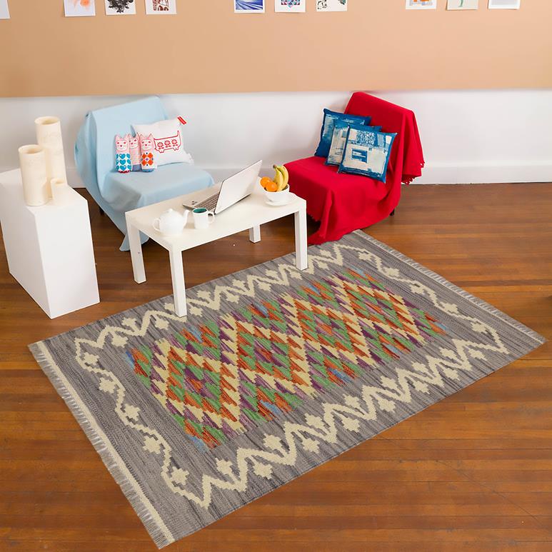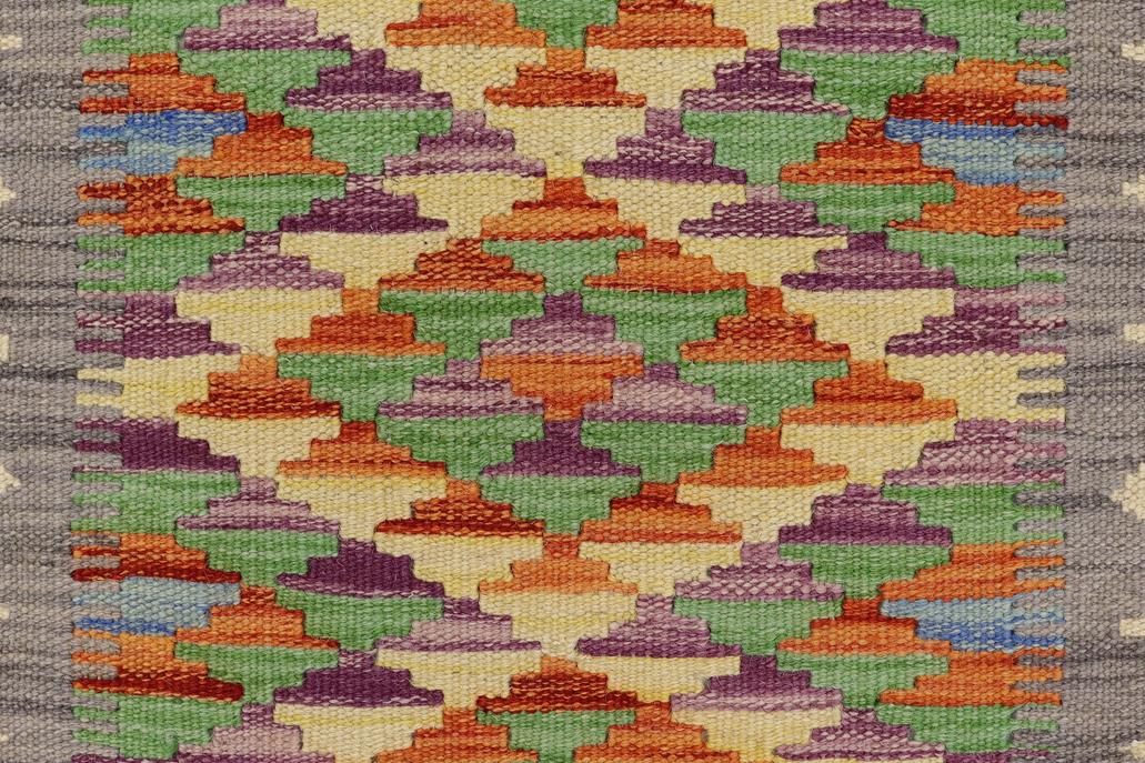 Elevate the elegance of your home with this stunning hand-woven tribal Kilim wool rug. Meticulously crafted on a loom by the Nomad Turkman people using hand-spun wool and 100% natural vegetable dyes, these rugs are recognized for their repetitive geometric patterns, incorporating naturalistic floral and traditional designs. The contemporary fashion palette results in bold, sharp patterns that are incredibly versatile, as the pattern is the same on both sides. These reversible rugs feature a lighter shade on one side and brighter colors on the other, providing versatility according to preference. These unique rugs are made by knotting short strands of different colors onto the warps and securing them by tightly pressing the wefts. The designs are created by interweaving the various colored wefts and warps. Kilims are known for their exceptional durability and versatility, making them truly unique rugs.