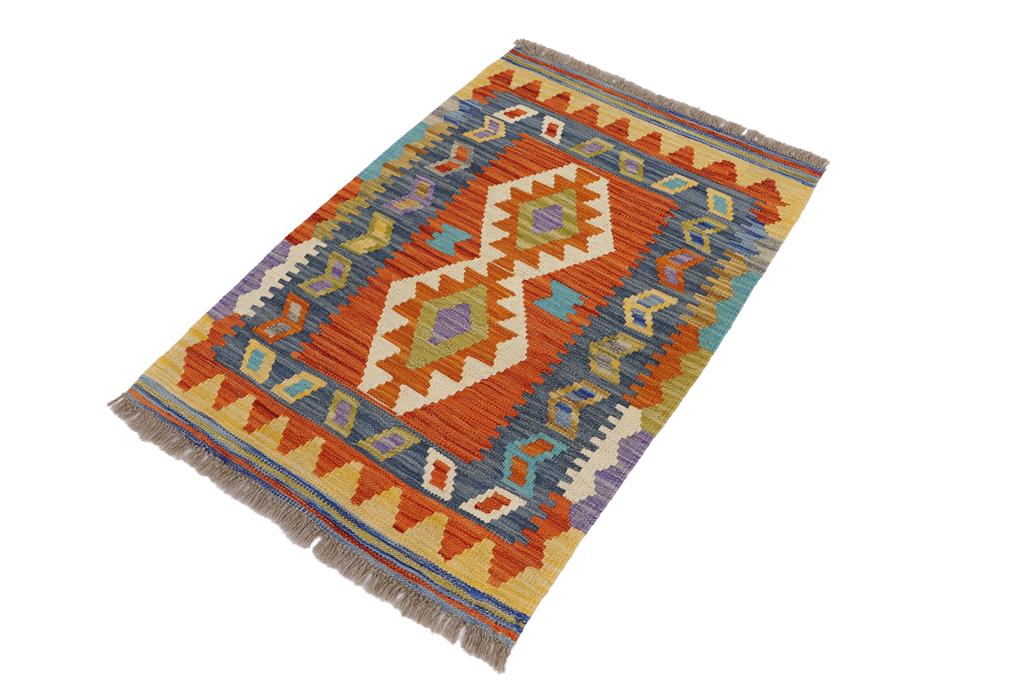 Elevate the elegance of your home with this stunning hand-woven tribal Kilim wool rug. Meticulously crafted on a loom by the Nomad Turkman people using hand-spun wool and 100% natural vegetable dyes, these rugs are recognized for their repetitive geometric patterns, incorporating naturalistic floral and traditional designs. The contemporary fashion palette results in bold, sharp patterns that are incredibly versatile, as the pattern is the same on both sides. These reversible rugs feature a lighter shade on one side and brighter colors on the other, providing versatility according to preference. These unique rugs are made by knotting short strands of different colors onto the warps and securing them by tightly pressing the wefts. The designs are created by interweaving the various colored wefts and warps. Kilims are known for their exceptional durability and versatility, making them truly unique rugs.